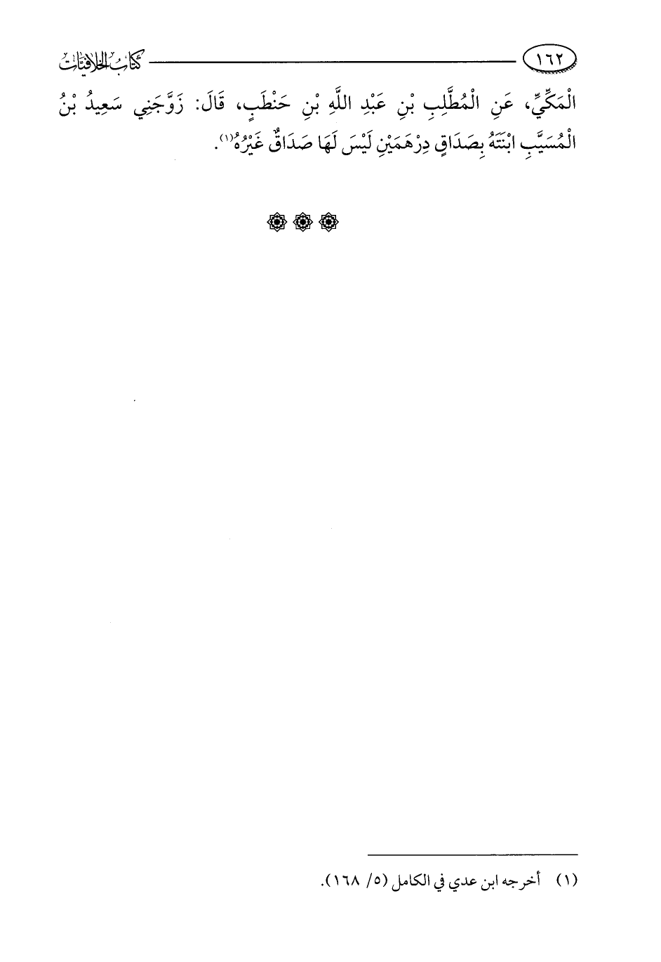 الْمَكِّيِّ، عَنِ الْمُطَّلِبِ بْنِ عَبْدِ اللَّهِ بْنِ حَنْطَبٍ، قَالَ: زَوَّجَنِي سَعِيدُ بْنُ الْمُسَيَّبِ ابْنَتَهُ بِصَدَاقٍ دِرْهَمَيْنِ لَيْسَ لَهَا صَدَاقٌ غَيْرُهُ (¬1).