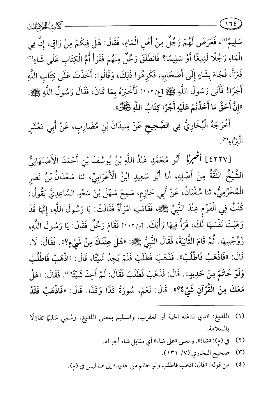 سَلِيمٌ (¬1)، فَعَرَضَ لَهُمْ رَجُلٌ مِنْ أَهْلِ الْمَاءِ، فَقَالَ: هَلْ فِيكُمْ مِنْ رَاقٍ، إِنَّ فِي الْمَاءِ رَجُلًا لَدِيغًا أَوْ سَلِيمًا؟ فَانْطَلَقَ رَجُلٌ مِنْهُمْ فَقَرَأَ أُمَّ الْكِتَابِ عَلَى شَاءٍ (¬2) فَبَرَأَ، فَجَاءَ بِشَاءٍ إِلَى أَصْحَابِهِ، فَكَرِهُوا ذَلِكَ، وَقَالُوا: أَخَذْتَ عَلَى كِتَابِ اللَّهِ أَجْرًا! فَأَتَى رَسُولَ اللَّهِ - صلى الله عليه وسلم - فَأَخْبَرَهُ بِمَا كَانَ، فَقَالَ رَسُولُ اللَّهِ - صلى الله عليه وسلم -: "إِنَّ أَحَقَّ مَا أَخَذْتُمْ عَلَيْهِ أَجْرًا كِتَابُ اللَّهِ - عز وجل -".