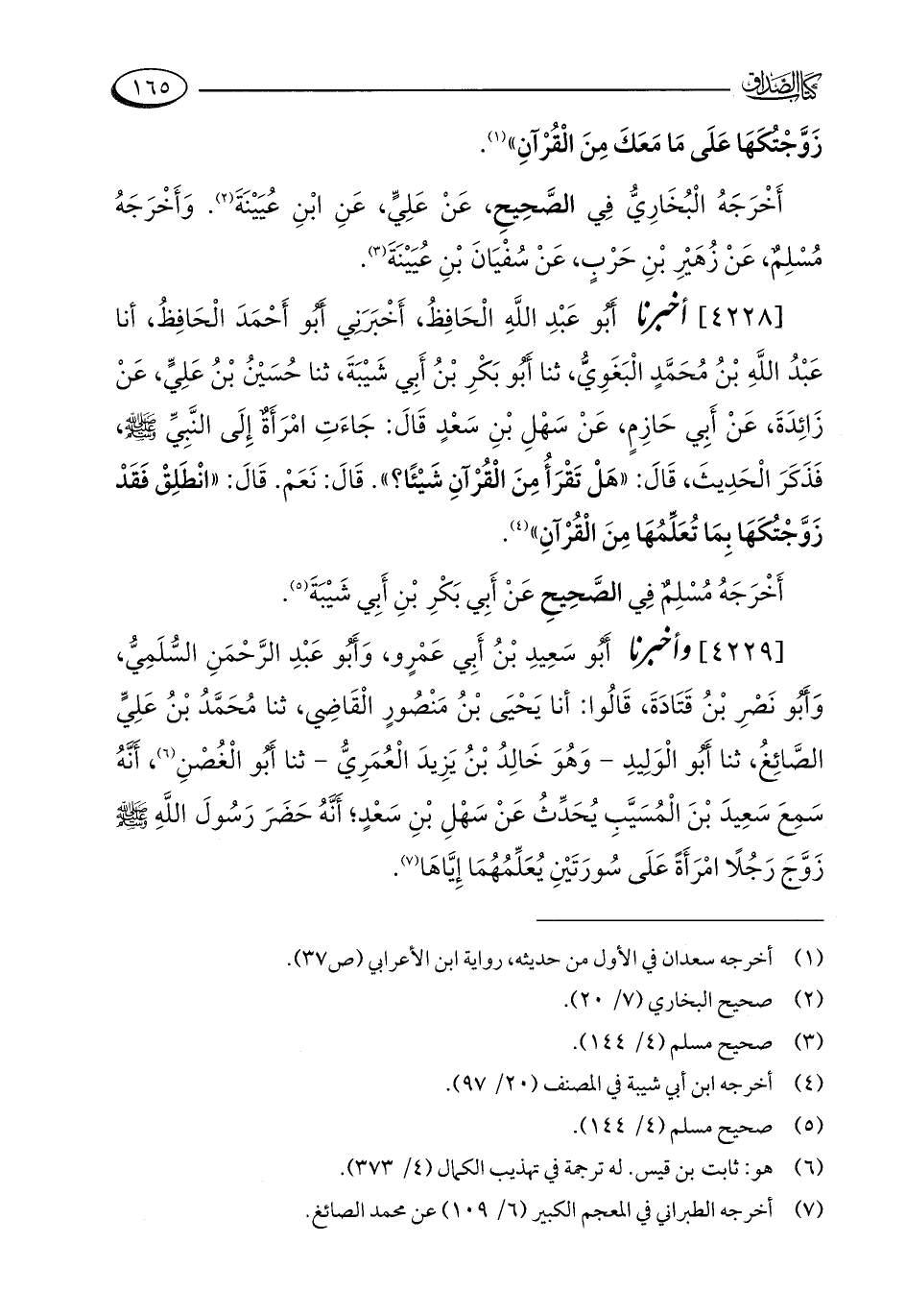 [4228] أخبرنا أَبُو عَبْدِ اللَّهِ الْحَافِظُ، أَخْبَرَنِي أَبُو أَحْمَدَ الْحَافِظُ، أنا عَبْدُ اللَّهِ بْنُ مُحَمَّدٍ الْبَغَوِيُّ، ثنا أَبُو بَكْرِ بْنُ أَبِي شَيْبَةَ، ثنا حُسَيْنُ بْنُ عَلِيٍّ، عَنْ زَائِدَةَ، عَنْ أَبِي حَازِمٍ، عَنْ سَهْلِ بْنِ سَعْدٍ قَالَ: جَاءَتِ امْرَأَةٌ إِلَى النَّبِيِّ - صلى الله عليه وسلم -، فَذَكَرَ الْحَدِيثَ، قَالَ: "هَلْ تَقْرَأُ مِنَ الْقُرآنِ شَيْئًا؟ ". قَالَ: نَعَمْ. قَالَ: "انْطَلِقْ فَقَدْ زَوَّجْتُكَهَا بِمَا تُعَلِّمُهَا مِنَ الْقُرْآنِ" (¬4).