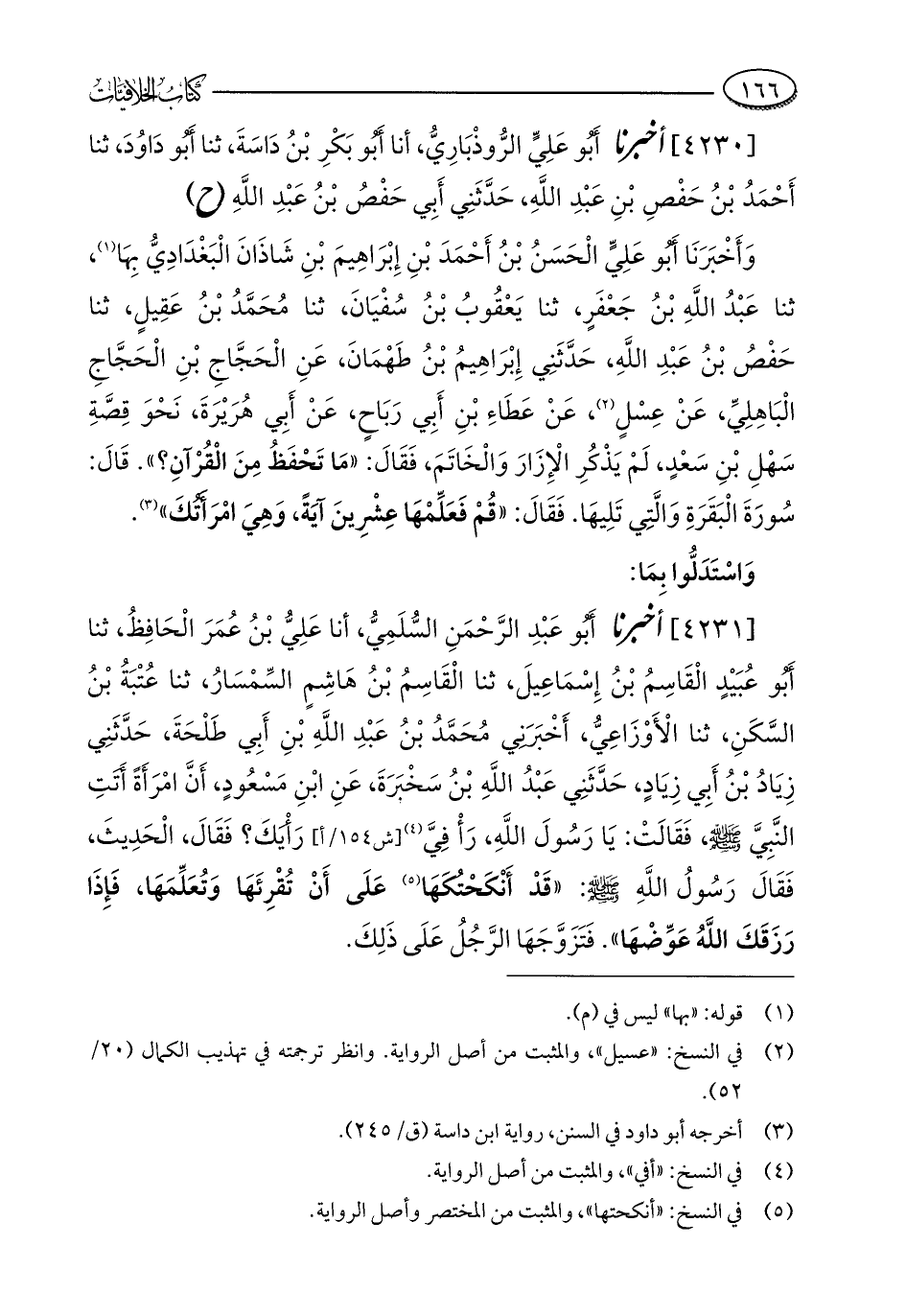 [4231] أخبرنا أَبُو عَبْدِ الرَّحْمَنِ السُّلَمِيُّ، أنا عَلِيُّ بْنُ عُمَرَ الْحَافِظُ، ثنا أَبُو عُبَيْدٍ الْقَاسِمُ بْنُ إِسْمَاعِيلَ، ثنا الْقَاسِمُ بْنُ هَاشِمٍ السِّمْسَارُ، ثنا عُتْبَةُ بْنُ السَّكَنِ، ثنا الْأَوْزَاعِيُّ، أَخْبَرَنِي مُحَمَّدُ بْنُ عَبْدِ اللَّهِ بْنِ أَبِي طَلْحَةَ، حَدَّثَنِي زِيَادُ بْنُ أَبِي زِيَادٍ، حَدَّثَنِي عَبْدُ اللَّهِ بْنُ سَخْبَرَةَ، عَنِ ابْنِ مَسْعُودٍ، أَنَّ امْرَأَةً أَتَتِ النَّبِيَّ - صلى الله عليه وسلم -، فَقَالَتْ: يَا رَسُولَ اللَّهِ، رَأْ فِيَّ (¬4) رَأْيَكَ؟ فَقَالَ، الْحَدِيثَ، فَقَالَ رَسُولُ اللَّهِ - صلى الله عليه وسلم -: "قَدْ أَنْكَحْتُكَهَا (¬5) عَلَى أَنْ تُقْرِئَهَا وَتُعَلِّمَهَا، فَإِذَا رَزَقَكَ اللَّهُ عَوِّضْهَا". فَتَزَوَّجَهَا الرَّجُلُ عَلَى ذَلِكَ.