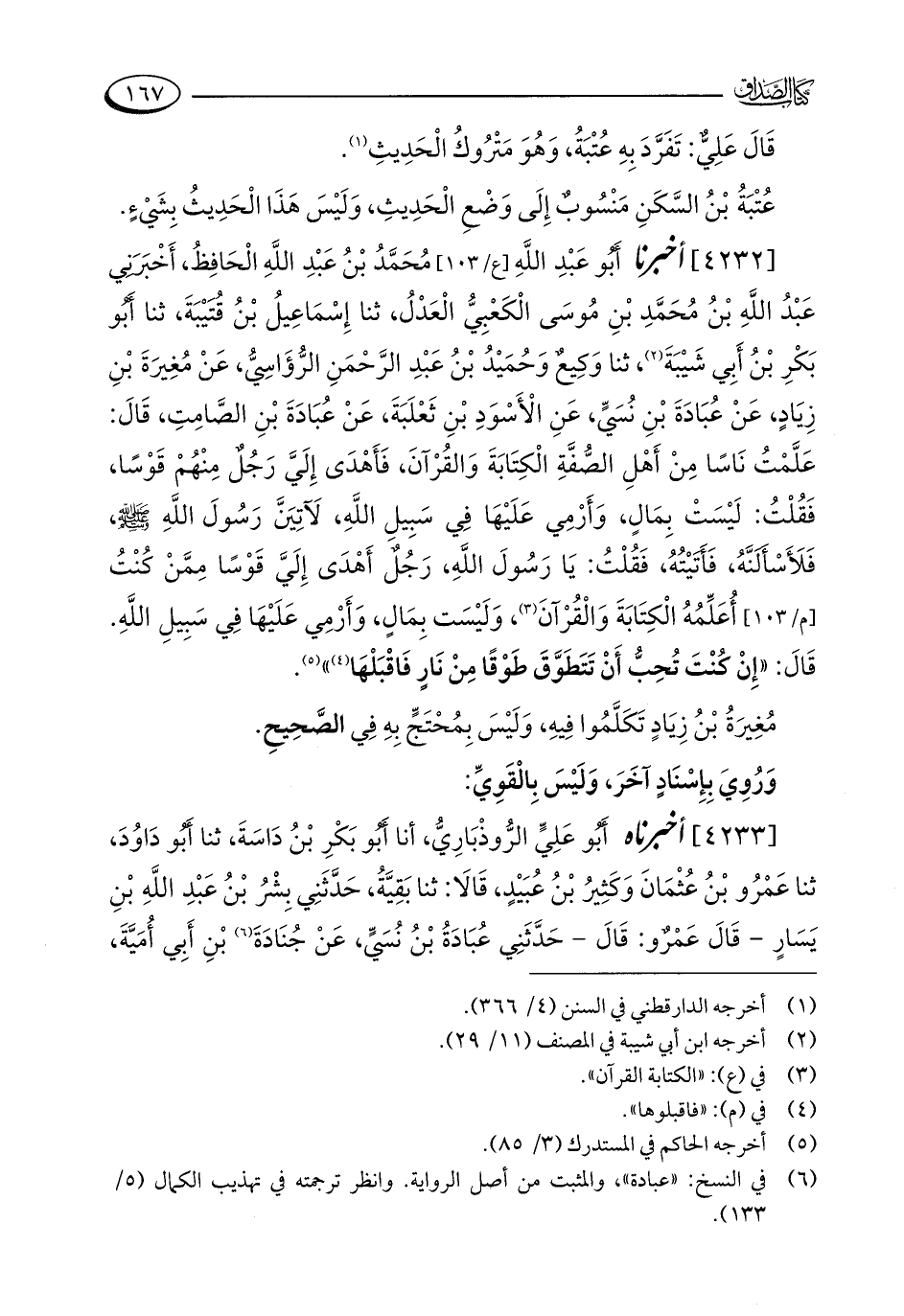[4232] أخبرنا أَبُو عَبْدِ اللَّهِ مُحَمَّدُ بْنُ عَبْدِ اللَّهِ الْحَافِظُ، أَخْبَرَنِي عَبْدُ اللَّهِ بْنُ مُحَمَّدِ بْنِ مُوسَى الْكَعْبِيُّ الْعَدْلُ، ثنا إِسْمَاعِيلُ بْنُ قُتَيْبَةَ، ثنا أَبُو بَكْرِ بْنُ أَبِي شَيْبَةَ (¬2)، ثنا وَكِيعٌ وَحُمَيْدُ بْنُ عَبْدِ الرَّحْمَنِ الرُّؤَاسِيُّ، عَنْ مُغِيرَةَ بْنِ زِيَادٍ، عَنْ عُبَادَةَ بْنِ نُسَيٍّ، عَنِ الْأَسْوَدِ بْنِ ثَعْلَبَةَ، عَنْ عُبَادَةَ بْنِ الصَّامِتِ، قَالَ: عَلَّمْتُ نَاسًا مِنْ أَهْلِ الصُّفَّةِ الْكِتَابَةَ وَالقُرْآنَ، فَأَهْدَى إِلَيَّ رَجُلٌ مِنْهُمْ قَوْسًا، فَقُلْتُ: لَيْسَتْ بِمَالٍ، وَأَرْمِي عَلَيْهَا فِي سَبِيل اللَّهِ، لَآتِيَنَّ رَسُولَ اللَّهِ - صلى الله عليه وسلم -، فَلَأَسْأَلَنَّهُ، فَأَتَيْتُهُ، فَقُلْتُ: يَا رَسُولَ اللَّهِ، رَجُلٌ أَهْدَى إِلَيَّ قَوْسًا مِمَّنْ كُنْتُ أُعَلِّمُهُ الْكِتَابَةَ وَالْقُرْآنَ (¬3)، وَلَيْسَت بِمَالٍ، وَأَرْمِي عَلَيْهَا فِي سَبِيلِ اللَّهِ. قَالَ: "إِنْ كُنْتَ تُحِبُّ أَنْ تَتَطَوَّقَ طَوْقًا مِنْ نَارٍ فَاقْبَلْهَا (¬4) " (¬5).