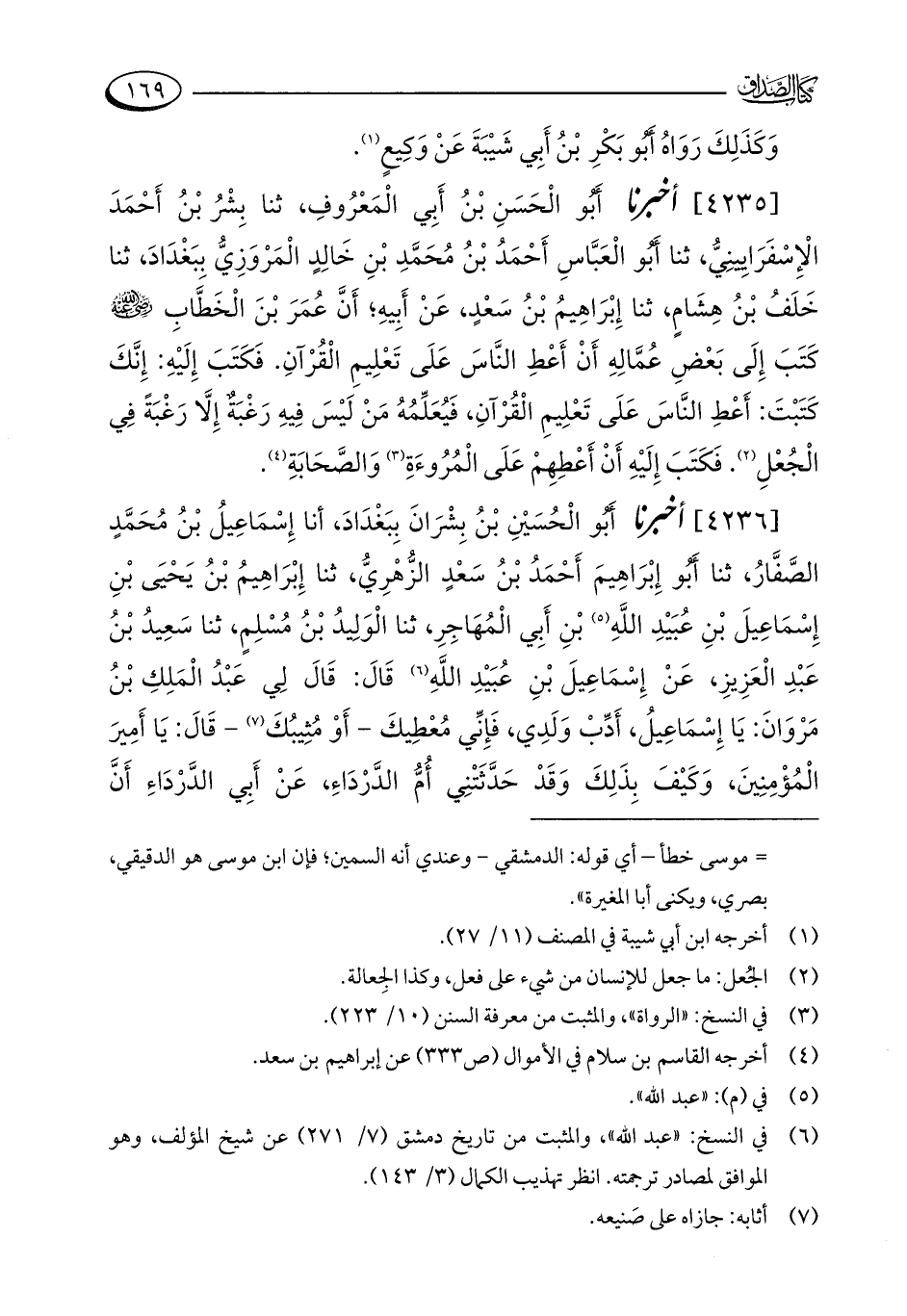 [4236] أخبرنا أَبُو الْحُسَيْنِ بْنُ بِشْرَانَ بِبَغْدَادَ، أنا إِسْمَاعِيلُ بْنُ مُحَمَّدٍ الصَّفَّارُ، ثنا أَبُو إِبْرَاهِيمَ أَحْمَدُ بْنُ سَعْدٍ الزُّهْرِيُّ، ثنا إِبْرَاهِيمُ بْنُ يَحْيَى بْنِ إِسْمَاعِيلَ بْنِ عُبَيْدِ اللَّهِ (¬5) بْنِ أَبِي الْمُهَاجِرِ، ثنا الْوَلِيدُ بْنُ مُسْلِمٍ، ثنا سَعِيدُ بْنُ عَبْدِ الْعَزِيزِ، عَنْ إِسْمَاعِيلَ بْنِ عُبَيْدِ اللَّهِ (¬6) قَالَ: قَالَ لِي عَبْدُ الْمَلِكِ بْنُ مَرْوَانَ: يَا إِسْمَاعِيلُ، أَدِّبْ وَلَدِي، فَإِنِّي مُعْطِيكَ - أَوْ مُثِيبُكَ (¬7) - قَالَ: يَا أَمِيرَ الْمُؤْمِنِينَ، وَكَيْفَ بِذَلِكَ وَقَدْ حَدَّثَتْنِي أُمُّ الدَّرْدَاءِ، عَنْ أَبِي الدَّرْدَاءِ أَنَّ