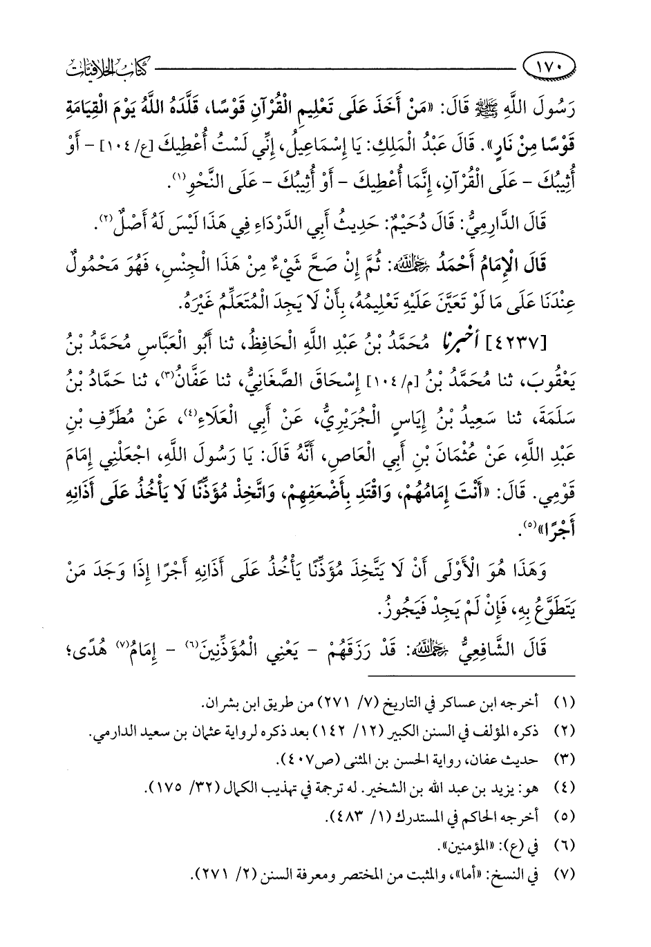 [4237] أخبرنا مُحَمَّدُ بْنُ عَبْدِ اللَّهِ الْحَافِظُ، ثنا أَبُو الْعَبَّاسِ مُحَمَّدُ بْنُ يَعْقُوبَ، ثنا مُحَمَّدُ بْنُ إِسْحَاقَ الصَّغَانِيُّ، ثنا عَفَّانُ (¬3)، ثنا حَمَّادُ بْنُ سَلَمَةَ، ثنا سَعِيدُ بْنُ إِيَاسٍ الْجُرَيْرِيُّ، عَنْ أَبِي الْعَلَاءِ (¬4)، عَنْ مُطَرِّفِ بْنِ عَبْدِ اللَّهِ، عَنْ عُثْمَانَ بْنِ أَبِي الْعَاصِ، أَنَّهُ قَالَ: يَا رَسُولَ اللَّهِ، اجْعَلْنِي إِمَامَ قَوْمِي. قَالَ: "أَنْتَ إِمَامُهُمْ، وَاقْتَدِ بِأَضْعَفِهِمْ، وَاتَّخِذْ مُؤَذِّنًا لَا يَأْخُذُ عَلَى أَذَانِهِ أَجْرًا" (¬5).
