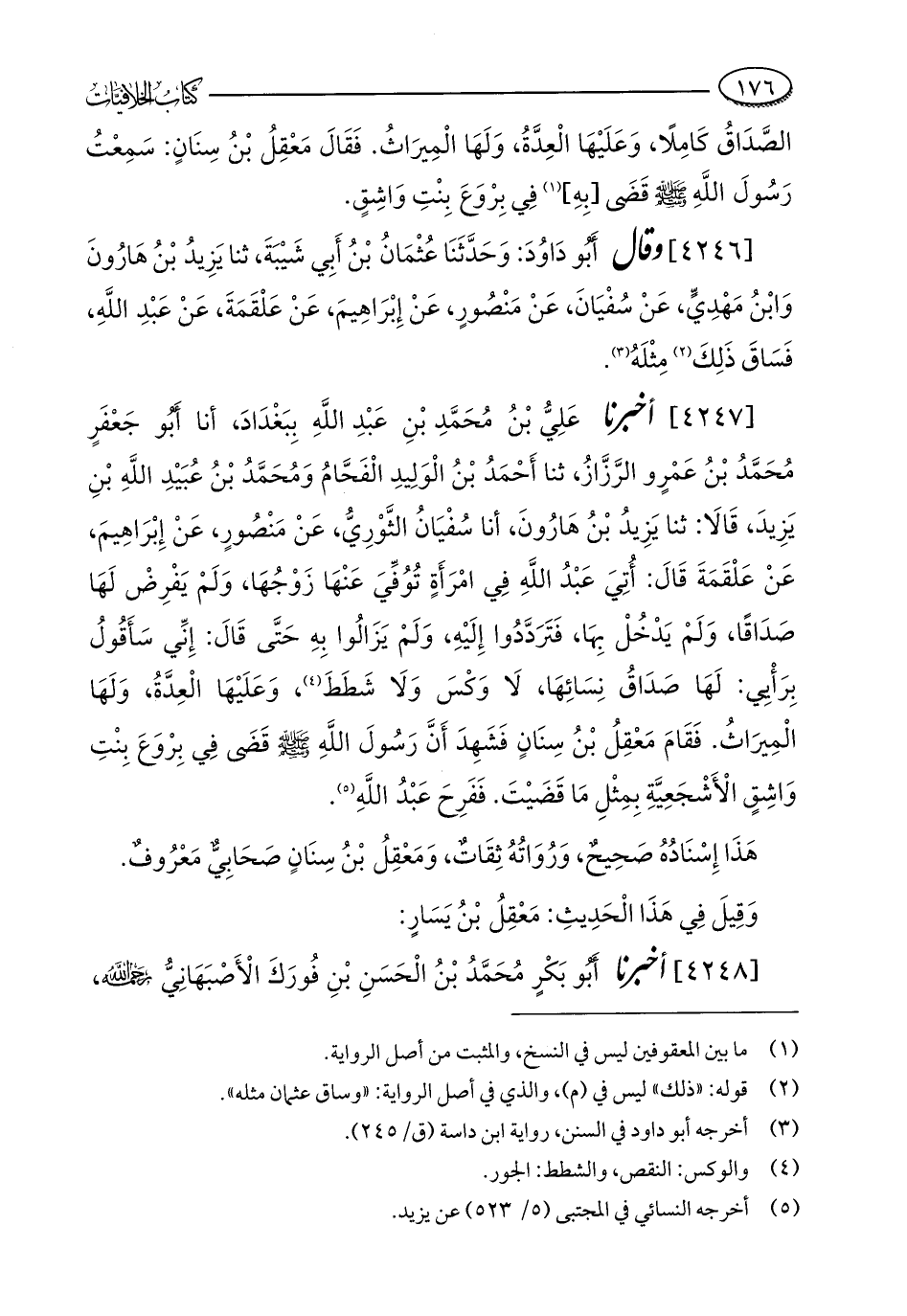 [4247] أخبرنا عَلِيُّ بْنُ مُحَمَّدِ بْنِ عَبْدِ اللَّهِ بِبَغْدَادَ، أنا أَبُو جَعْفَرٍ مُحَمَّدُ بْنُ عَمْرٍو الرَّزَّازُ، ثنا أَحْمَدُ بْنُ الْوَلِيدِ الْفَحَّامُ وَمُحَمَّدُ بْنُ عُبَيْدِ اللَّهِ بْنِ يَزِيدَ، قَالَا: ثنا يَزِيدُ بْنُ هَارُونَ، أنا سُفْيَانُ الثَّوْرِيُّ، عَنْ مَنْصُورٍ، عَنْ إِبْرَاهِيمَ، عَنْ عَلْقَمَةَ قَالَ: أُتِيَ عَبْدُ اللَّهِ فِي امْرَأَةٍ تُوُفِّيَ عَنْهَا زَوْجُهَا، وَلَمْ يَفْرِضْ لَهَا صَدَاقًا، وَلَمْ يَدْخُلْ بِهَا، فَتَرَدَّدُوا إِلَيْهِ، وَلَمْ يَزَالُوا بِهِ حَتَّى قَالَ: إِنِّي سَأَقُولُ بِرَأْيِي: لَهَا صَدَاقُ نِسَائِهَا، لَا وَكْسَ وَلَا شَطَطَ (¬4)، وَعَلَيْهَا الْعِدَّةُ، وَلَهَا الْمِيرَاثُ. فَقَامَ مَعْقِلُ بْنُ سِنَانٍ فَشَهِدَ أَنَّ رَسُولَ اللَّهِ - صلى الله عليه وسلم - قَضَى فِي بِرْوَعَ بِنْتِ وَاشِقٍ الْأَشْجَعِيَّةِ بِمِثْلِ مَا قَضَيْتَ. فَفَرِحَ عَبْدُ اللَّهِ (¬5).