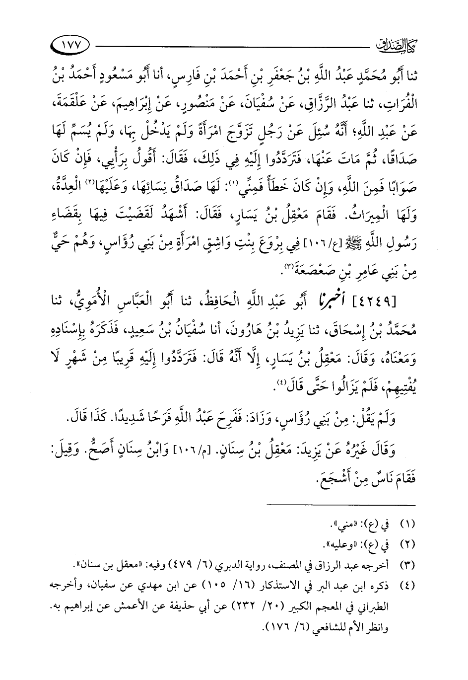 ثنا أَبُو مُحَمَّدٍ عَبْدُ اللَّهِ بْنُ جَعْفَرِ بْنِ أَحْمَدَ بْنِ فَارِسٍ، أنا أَبُو مَسْعُودٍ أَحْمَدُ بْنُ الْفُرَاتِ، ثنا عَبْدُ الرَّزَّاقِ، عَنْ سُفْيَانَ، عَنْ مَنْصُورٍ، عَنْ إِبْرَاهِيمَ، عَنْ عَلْقَمَةَ، عَنْ عَبْدِ اللَّهِ؛ أَنَّهُ سُئِلَ عَنْ رَجُلٍ تَزَوَّجَ امْرَأَةً وَلَمْ يَدْخُلْ بِهَا، وَلَمْ يُسَمِّ لَهَا صَدَاقًا، ثُمَّ مَاتَ عَنْهَا، فَتَرَدَّدُوا إِلَيْهِ فِي ذَلِكَ، فَقَالَ: أَقُولُ بِرَأْيِي، فَإِنْ كَانَ صَوَابًا فَمِنَ اللَّهِ، وَإِنْ كَانَ خَطَأً فَمِنِّي (¬1): لَهَا صَدَاقُ نِسَائِهَا، وَعَلَيْهَا (¬2) الْعِدَّةُ، وَلَهَا الْمِيرَاثُ. فَقَامَ مَعْقِلُ بْنُ يَسَارٍ، فَقَالَ: أَشْهَدُ لَقَضَيْتَ فِيهَا بِقَضَاءِ رَسُولِ اللَّهِ - صلى الله عليه وسلم - فِي بِرْوَعَ بِنْتِ وَاشِقٍ امْرَأَةٍ مِنْ بَنِي رُؤَاسٍ، وَهُمْ حَيٌّ مِنْ بَنِي عَامِرِ بْنِ صَعْصَعَةَ (¬3).