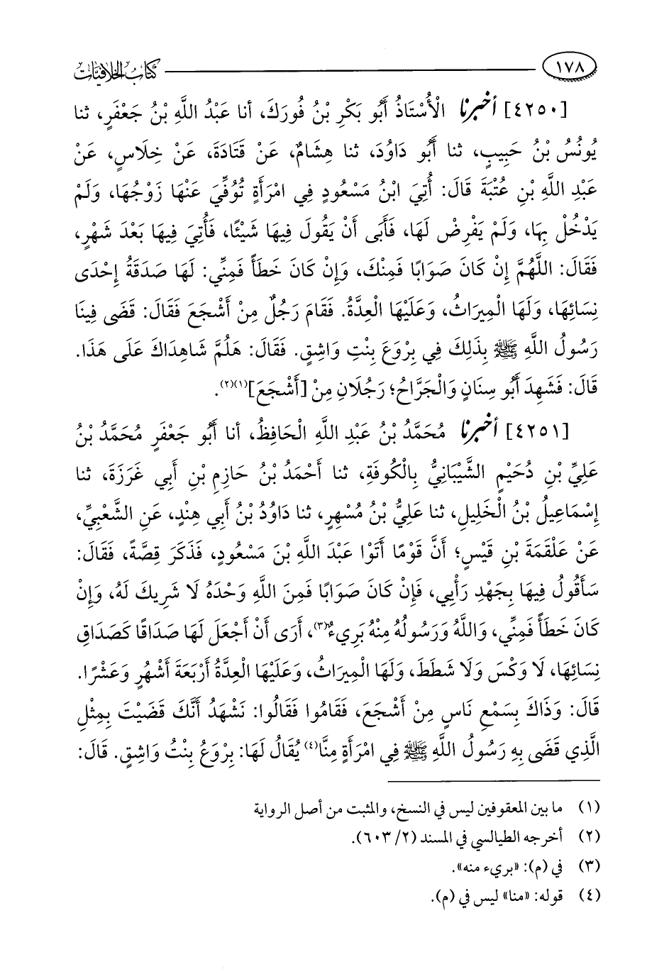 [4250] أخبرنا الْأُسْتَاذُ أَبُو بَكْرِ بْنُ فُورَكَ، أنا عَبْدُ اللَّهِ بْنُ جَعْفَرٍ، ثنا يُونُسُ بْنُ حَبِيبٍ، ثنا أَبُو دَاوُدَ، ثنا هِشَامٌ، عَنْ قَتَادَةَ، عَنْ خِلَاسٍ، عَنْ عَبْدِ اللَّهِ بْنِ عُتْبَةَ قَالَ: أُتِيَ ابْنُ مَسْعُودٍ فِي امْرَأَةٍ تُوُفِّيَ عَنْهَا زَوْجُهَا، وَلَمْ يَدْخُلْ بِهَا، وَلَمْ يَفْرِضْ لَهَا، فَأَبَى أَنْ يَقُولَ فِيهَا شَيْئًا، فَأُتِيَ فِيهَا بَعْدَ شَهْرٍ، فَقَالَ: اللَّهُمَّ إِنْ كَانَ صَوَابًا فَمِنْكَ، وَإِنْ كَانَ خَطَأً فَمِنِّي: لَهَا صَدَقَةُ إِحْدَى نِسَائِهَا، وَلَهَا الْمِيرَاثُ، وَعَلَيْهَا الْعِدَّةُ. فَقَامَ رَجُلٌ مِنْ أَشْجَعَ فَقَالَ: قَضَى فِينَا رَسُولُ اللَّهِ - صلى الله عليه وسلم - بِذَلِكَ فِي بِرْوَعَ بِنْتِ وَاشِقٍ. فَقَالَ: هَلُمَّ شَاهِدَاكَ عَلَى هَذَا. قَالَ: فَشَهِدَ أَبُو سِنَانٍ وَالْجَرَّاحُ؛ رَجُلَانِ مِنْ [أَشْجَعَ] (¬1) (¬2).