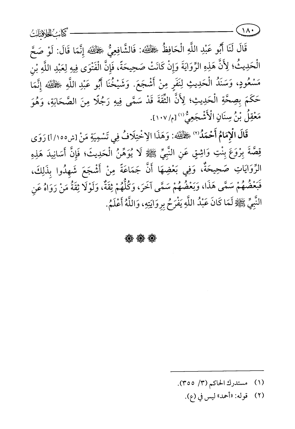 قَالَ لَنَا أَبُو عَبْدِ اللَّهِ الْحَافِظُ - رحمه الله -: فَالشَّافِعِيُّ - رحمه الله - إِنَّمَا قَالَ: لَوْ صَحَّ الْحَدِيثُ؛ لِأَنَّ هَذِهِ الرِّوَايَةَ وَإِنْ كَانَتْ صَحِيحَةً، فَإِنَّ الْفَتْوَى فِيهِ لِعَبْدِ اللَّهِ بْنِ مَسْعُودٍ، وَسَنَدُ الْحَدِيثِ لِنَفَرٍ مِنْ أَشْجَعَ. وَشَيْخُنَا أَبُو عَبْدِ اللَّهِ - رحمه الله - إِنَّمَا حَكَمَ بِصِحَّةِ الْحَدِيثِ؛ لِأَنَّ الثِّقَةَ قَدْ سَمَّى فِيهِ رَجُلًا مِنَ الصَّحَابَةِ، وَهُوَ مَعْقِلُ بْنُ سِنَانٍ الْأَشْجَعِيُّ (¬1).