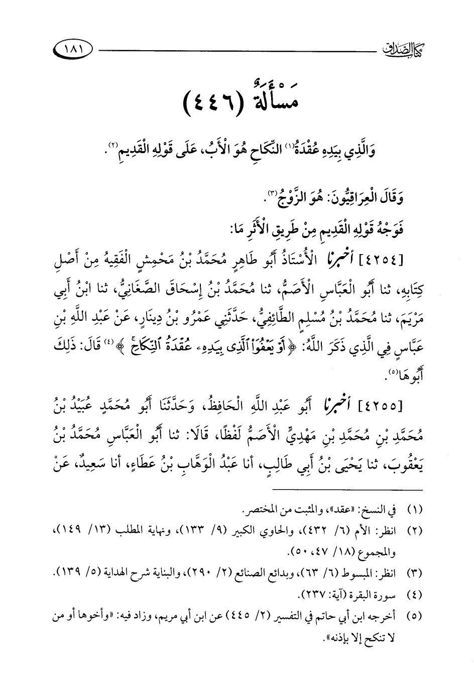 [4254] أخبرنا الْأُسْتَاذُ أَبُو طَاهِرٍ مُحَمَّدُ بْنُ مَحْمِشٍ الْفَقِيهُ مِنْ أَصْلِ كِتَابِهِ، ثنا أَبُو الْعَبَّاسِ الْأَصَمُّ، ثنا مُحَمَّدُ بْنُ إِسْحَاقَ الصَّغَانِيُّ، ثنا ابْنُ أَبِي مَرْيَمَ، ثنا مُحَمَّدُ بْنُ مُسْلِمٍ الطَّائِفِيُّ، حَدَّثَنِي عَمْرُو بْنُ دِينَارٍ، عَنْ عَبْدِ اللَّهِ بْنِ عَبَّاسٍ فِي الَّذِي ذَكَرَ اللَّهُ: {أَوْ يَعْفُوَ الَّذِي بِيَدِهِ عُقْدَةُ النِّكَاحِ} (¬4) قَالَ: ذَلِكَ أَبُوهَا (¬5).
