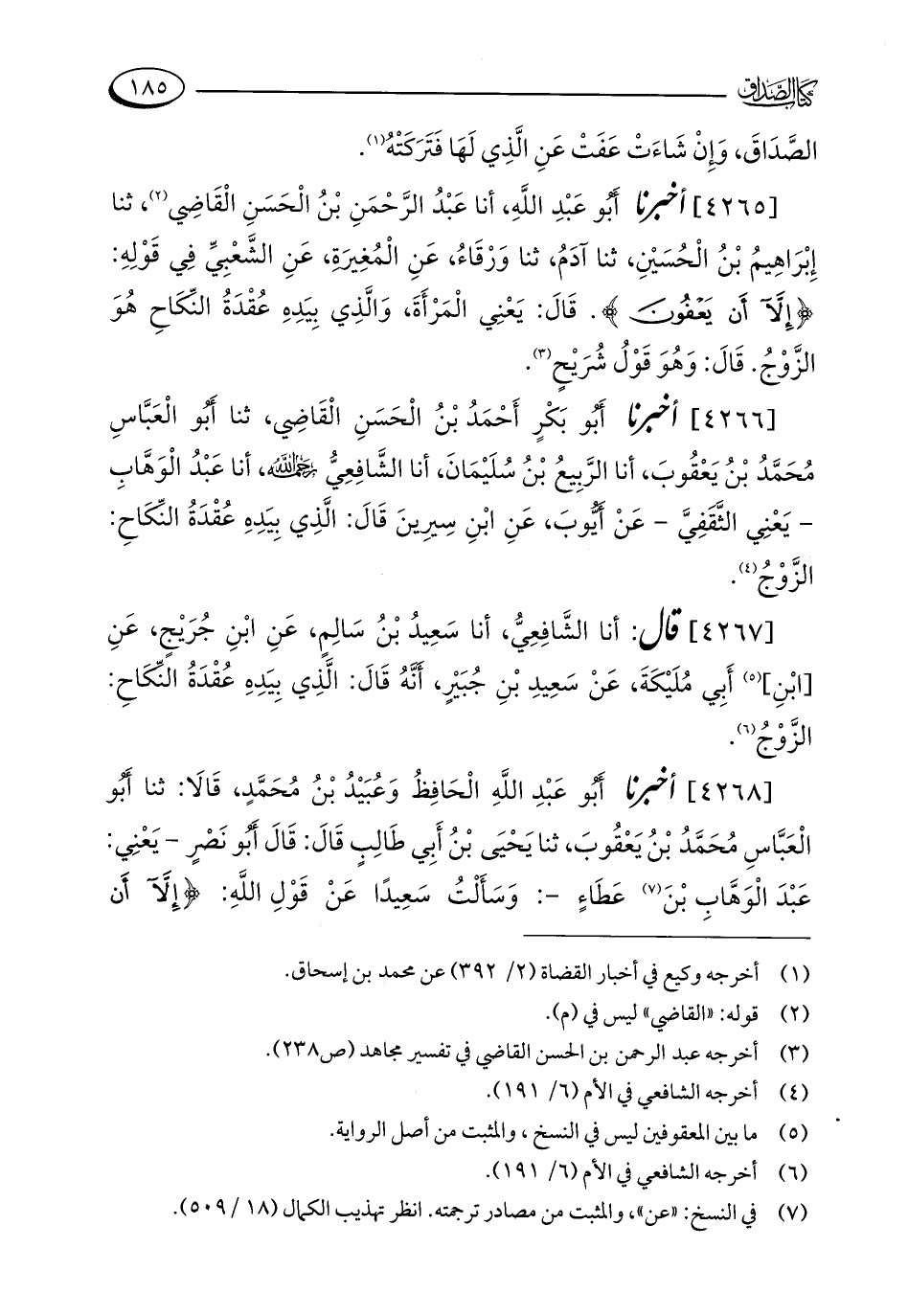 [4265] أخبرنا أَبُو عَبْدِ اللَّهِ، أنا عَبْدُ الرَّحْمَنِ بْنُ الْحَسَنِ الْقَاضِي (¬2)، ثنا إِبْرَاهِيمُ بْنُ الْحُسَيْنِ، ثنا آدَمُ، ثنا وَرْقَاءُ، عَنِ الْمُغِيرَةِ، عَنِ الشَّعْبِيِّ فِي قَوْلِهِ: {إِلَّا أَنْ يَعْفُونَ}. قَالَ: يَعْنِي الْمَرْأَةَ، وَالَّذِي بِيَدِهِ عُقْدَةُ النِّكَاحِ هُوَ الزَّوْجُ. قَالَ: وَهُوَ قَوْلُ شُرَيْحٍ (¬3).