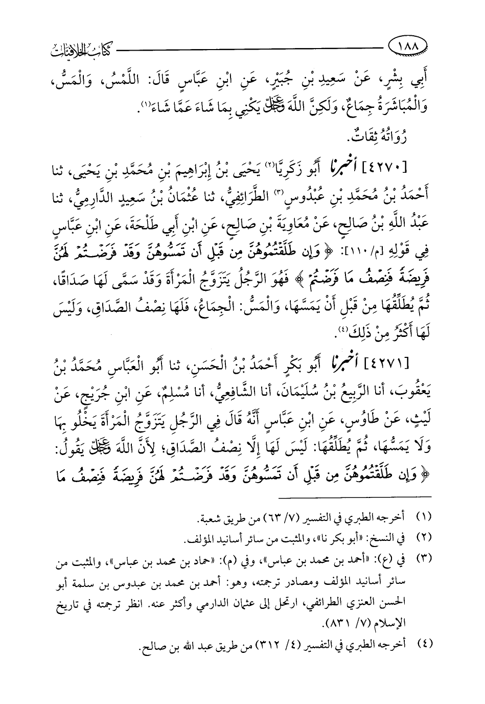 [4270] أخبرنا أَبُو زَكَرِيَّا (¬2) يَحْيَى بْنُ إِبْرَاهِيمَ بْنِ مُحَمَّدِ بْنِ يَحْيَى، ثنا أَحْمَدُ بْنُ مُحَمَّدِ بْنِ عُبْدُوسٍ (¬3) الطَّرَائِفِيُّ، ثنا عُثْمَانُ بْنُ سَعِيدٍ الدَّارِمِيُّ، ثنا عَبْدُ اللَّهِ بْنُ صَالِحٍ، عَنْ مُعَاوِيَةَ بْنِ صَالِحٍ، عَنِ ابْنِ أَبِي طَلْحَةَ، عَنِ ابْنِ عَبَّاسٍ فِي قَوْلِهِ: {وَإِنْ طَلَّقْتُمُوهُنَّ مِنْ قَبْلِ أَنْ تَمَسُّوهُنَّ وَقَدْ فَرَضْتُمْ لَهُنَّ فَرِيضَةً فَنِصْفُ مَا فَرَضْتُمْ} فَهُوَ الرَّجُلُ يَتَزَوَّجُ الْمَرْأَةَ وَقَدْ سَمَّى لَهَا صَدَاقًا، ثُمَّ يُطَلِّقُهَا مِنْ قَبْلِ أَنْ يَمَسَّهَا، وَالْمَسُّ: الْجِمَاعُ، فَلَهَا نِصْفُ الصَّدَاقِ، وَلَيْسَ لَهَا أَكْثَرُ مِنْ ذَلِكَ (¬4).