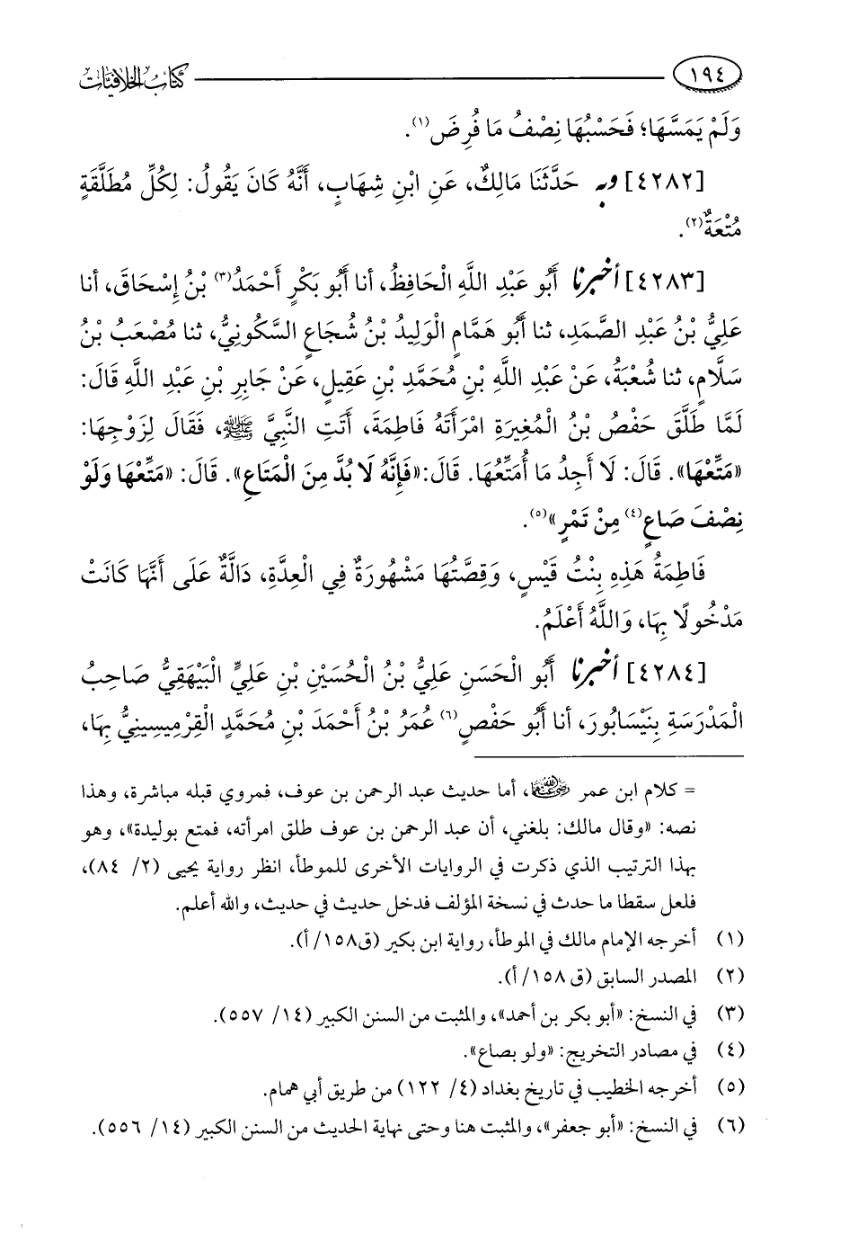 [4283] أخبرنا أَبُو عَبْدِ اللَّهِ الْحَافِظُ، أنا أَبُو بَكْرٍ أَحْمَدُ (¬3) بْنُ إِسْحَاقَ، أنا عَلِيُّ بْنُ عَبْدِ الصَّمَدِ، ثنا أَبُو هَمَّامٍ الْوَلِيدُ بْنُ شُجَاعٍ السَّكُونِيُّ، ثنا مُصْعَبُ بْنُ سَلَّامٍ، ثنا شُعْبَةُ، عَنْ عَبْدِ اللَّهِ بْنِ مُحَمَّدِ بْنِ عَقِيلٍ، عَنْ جَابِرِ بْنِ عَبْدِ اللَّهِ قَالَ: لَمَّا طَلَّقَ حَفْصُ بْنُ الْمُغِيرَةِ امْرَأَتَهُ فَاطِمَةَ، أَتَتِ النَّبِيَّ - صلى الله عليه وسلم -، فَقَالَ لِزَوْجِهَا: "مَتِّعْهَا". قَالَ: لَا أَجِدُ مَا أُمَتِّعُهَا. قَالَ: "فَإِنَّهُ لَا بُدَّ مِنَ الْمَتَاعِ". قَالَ: "مَتِّعْهَا وَلَوْ نِصْفَ صَاعٍ (¬4) مِنْ تَمْرٍ" (¬5).