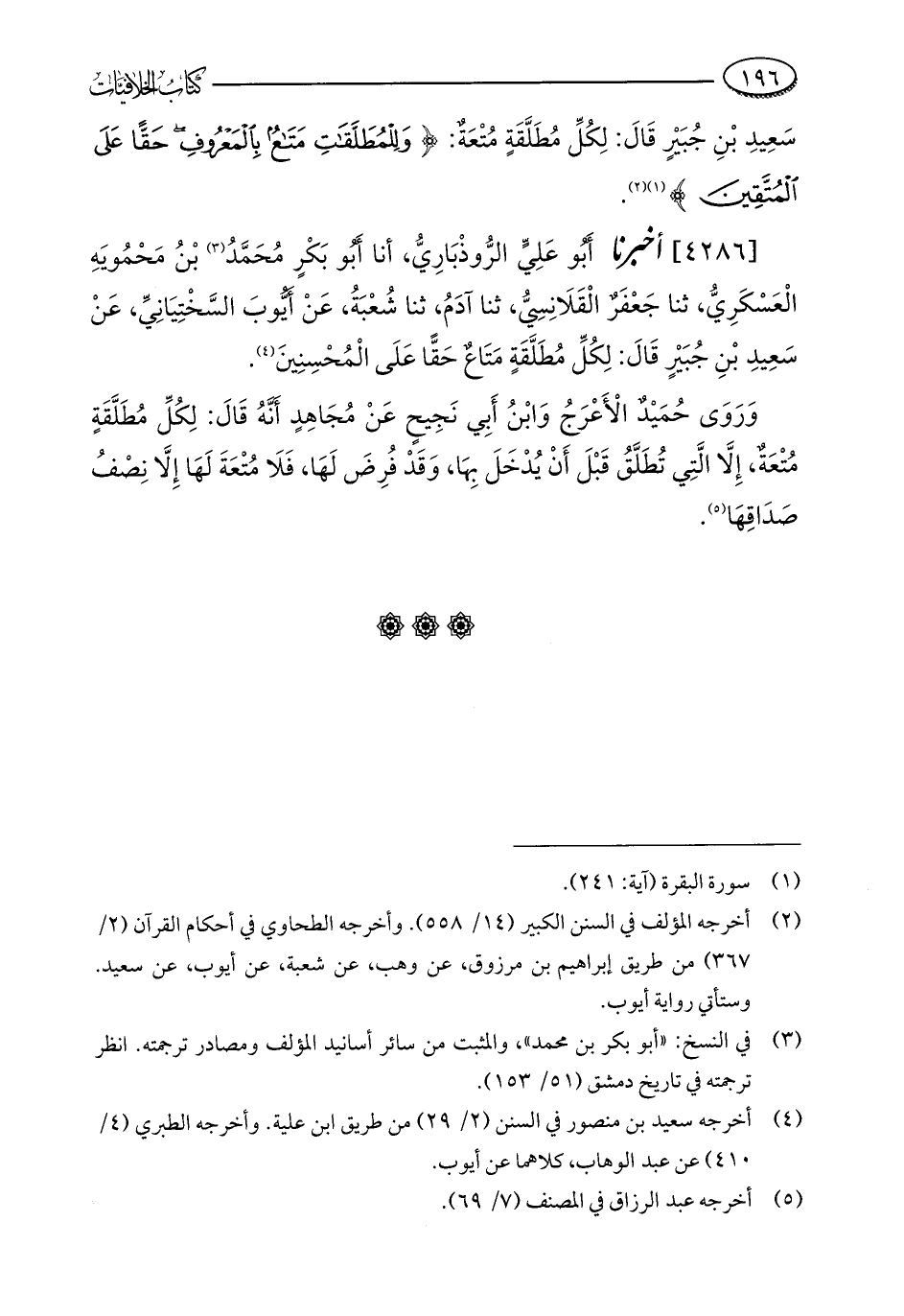 [4286] أخبرنا أَبُو عَلِيٍّ الرُّوذْبَارِيُّ، أنا أَبُو بَكْرٍ مُحَمَّدُ (¬3) بْنُ مَحْمُويَهِ الْعَسْكَرِيُّ، ثنا جَعْفَرٌ الْقَلَانِسِيُّ، ثنا آدَمُ، ثنا شُعْبَةُ، عَنْ أَيُّوبَ السَّخْتِيَانِيِّ، عَنْ سعِيدِ بْنِ جُبَيْرٍ قَالَ: لِكُلِّ مُطَلَّقَةٍ مَتَاعٌ حَقًّا عَلَى الْمُحْسِنِينَ (¬4).