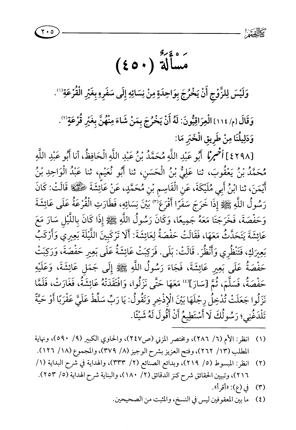 مَسْأَلَةٌ (450): وَلَيْسَ لِلزَّوْجِ أَنْ يَخْرُجَ بِوَاحِدَةٍ مِنْ نِسَائِهِ إِلَى سَفَرِهِ بِغَيْرِ الْقُرْعَةِ (¬1).