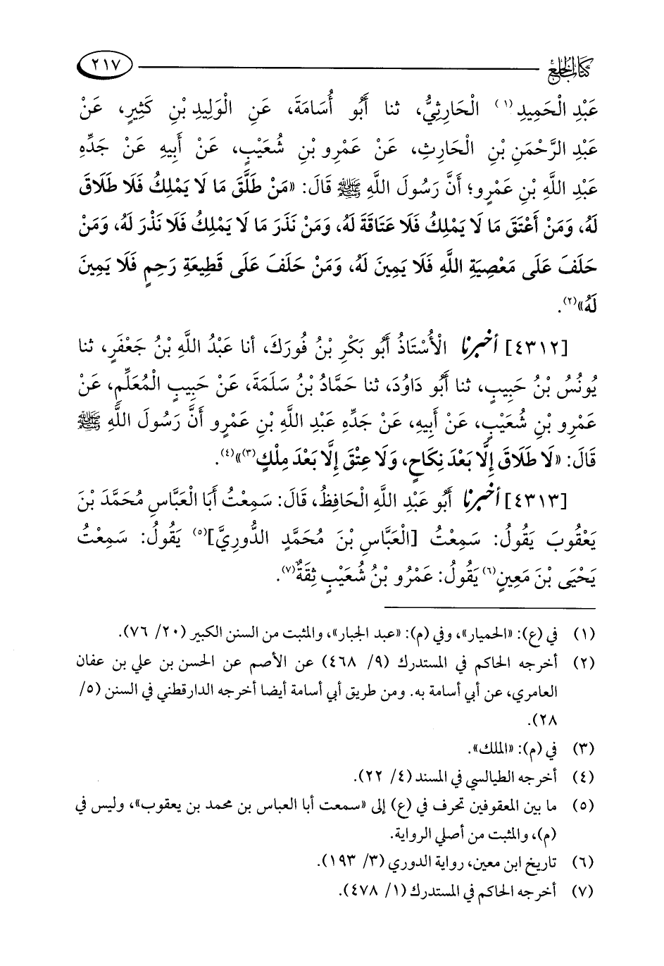 [4312] أخبرنا الْأُسْتَاذُ أَبُو بَكْرِ بْنُ فُورَكَ، أنا عَبْدُ اللَّهِ بْنُ جَعْفَرٍ، ثنا يُونُسُ بْنُ حَبِيبٍ، ثنا أَبُو دَاوُدَ، ثنا حَمَّادُ بْنُ سَلَمَةَ، عَنْ حَبيبٍ الْمُعَلِّمِ، عَنْ عَمْرِو بْنِ شُعَيْبٍ، عَنْ أَبِيهِ، عَنْ جَدِّهِ عَبْدِ اللَّهِ بْنِ عَمْرٍو أَنَّ رَسُولَ اللَّهِ - صلى الله عليه وسلم - قَالَ: "لَا طَلَاقَ إِلَّا بَعْدَ نِكَاحٍ، وَلَا عِتْقَ إِلَّا بَعْدَ مِلْكٍ (¬3) " (¬4).