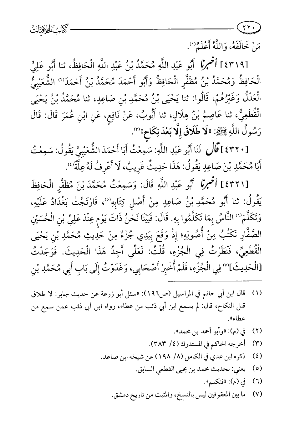 [4319] أخبرنا أَبُو عَبْدِ اللَّهِ مُحَمَّدُ بْنُ عَبْدِ اللَّهِ الْحَافِظُ، ثنا أَبُو عَلِيٍّ الْحَافِظُ وَمُحَمَّدُ بْنُ مُظَفَّرٍ الْحَافِظُ وَأَبُو أَحْمَدَ مُحَمَّدُ بْنُ أَحْمَدَ (¬2) الشُّعَيْبِيُّ الْعَدْلُ وَغَيْرُهُمْ، قَالُوا: ثنا يَحْيَى بْنُ مُحَمَّدِ بْنِ صَاعِدٍ، ثنا مُحَمَّدُ بْنُ يَحْيَى الْقُطَعِيُّ، ثنا عَاصِمُ بْنُ هِلَالٍ، ثنا أَيُّوبُ، عَنْ نَافِعٍ، عَنِ ابْنِ عُمَرَ قَالَ: قَالَ رَسُولُ اللَّهِ - صلى الله عليه وسلم -: "لَا طَلَاقَ إِلَّا بَعْدَ نِكَاحٍ" (¬3).