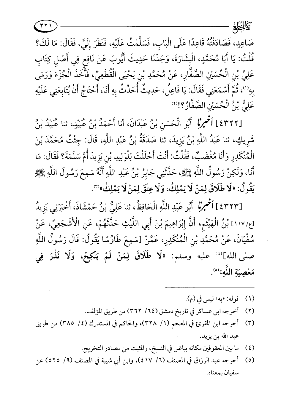 [4322] أخبرنا أَبُو الْحَسَنِ بْنُ عَبْدَانَ، أنا أَحْمَدُ بْنُ عُبَيْدٍ، ثنا عُبَيْدُ بْنُ شَرِيكٍ، ثنا عَبْدُ اللَّهِ بْنُ يَزِيدَ، ثنا صَدَقَةُ بْنُ عَبْدِ اللَّهِ، قَالَ: جِئْتُ مُحَمَّدَ بْنَ الْمُنْكَدِرِ وَأَنَا مُغْضَبٌ، فَقُلْتُ: أَنْتَ أَحْلَلْتَ لِلْوَلِيدِ بْنِ يَزِيدَ أُمَّ سَلَمَةَ؟ فَقَالَ: مَا أَنَا، وَلَكِنْ رَسُولُ اللَّهِ - صلى الله عليه وسلم -، حَدَّثَنِي جَابِرُ بْنُ عَبْدِ اللَّهِ أَنَّهُ سَمِعَ رَسُولَ اللَّهِ - صلى الله عليه وسلم - يَقُولُ: "لَا طَلَاقَ لِمَنْ لَا يَمْلِكُ، وَلَا عِتْقَ لِمَنْ لَا يَمْلِكُ" (¬3).
