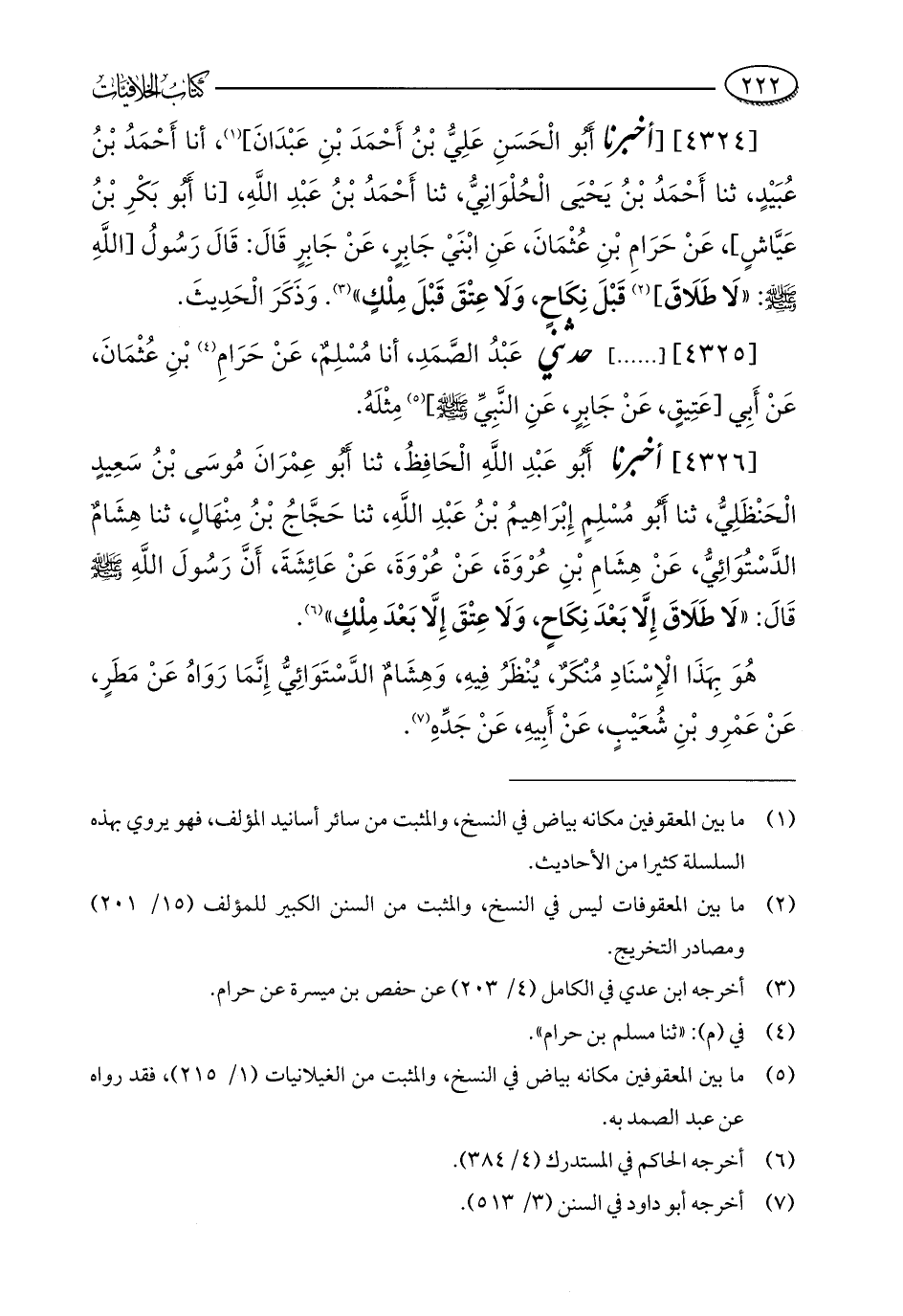 [4324] [أخبرنا أَبُو الْحَسَنِ عَلِيُّ بْنُ أَحْمَدَ بْنِ عَبْدَانَ] (¬1)، أنا أَحْمَدُ بْنُ عُبَيْدٍ، ثنا أَحْمَدُ بْنُ يَحْيَى الْحُلْوَانِيُّ، ثنا أَحْمَدُ بْنُ عَبْدِ اللَّهِ، [نا أَبُو بَكْرِ بْنُ عَيَّاشٍ]، عَنْ حَرَامِ بْنِ عُثْمَانَ، عَنِ ابْنَيْ جَابِرٍ، عَنْ جَابِرٍ قَالَ: قَالَ رَسُولُ [اللَّهِ - صلى الله عليه وسلم -: "لَا طَلَاقَ] (¬2) قَبْلَ نِكَاحٍ، وَلَا عِتْقَ قَبْلَ مِلْكٍ" (¬3). وَذَكَرَ الْحَدِيثَ.