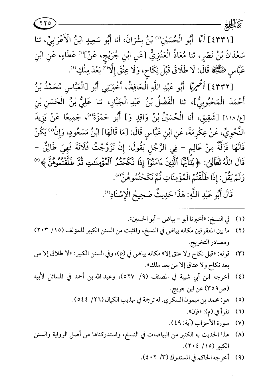 [4332] أخبرنا أَبُو عَبْدِ اللَّهِ الْحَافِظُ، أَخْبَرَنِي أَبُو [الْعَبَّاسِ مُحَمَّدُ بْنُ أَحْمَدَ الْمَحْبُوبِيُّ]، ثنا الْفَضْلُ بْنُ عَبْدِ الْجَبَّارِ، ثنا عَلِيُّ بْنُ الْحَسَنِ بْنِ [شَقِيقٍ، أنا الْحُسَيْنُ بْنُ وَاقِدٍ وَ] أَبُو حَمْزَةَ (¬5)، جَمِيعًا عَنْ يَزِيدَ النَّحْوِيِّ، عَنْ عِكْرِمَةَ، عَنِ ابْنِ عَبَّاسٍ قَالَ: [مَا قَالَهَا] ابْنُ مَسْعُودٍ، وَإِنْ (¬6) يَكُنْ قَالَهَا فَزَلَّةٌ مِنْ عَالِمٍ - فِي الرَّجُلِ يَقُولُ: إِنْ تَزَوَّجْتُ فُلَانَةَ فَهِيَ طَالِقٌ - قَالَ اللَّهُ تَعَالى: {يَاأَيُّهَا الَّذِينَ آمَنُوا إِذَا نَكَحْتُمُ الْمُؤْمِنَاتِ ثُمَّ طَلَّقْتُمُوهُنَّ} (¬7) وَلَمْ يَقُلْ: إِذَا طَلَّقْتُمُ الْمُؤْمِنَاتِ ثُمَّ نَكَحْتُمُوهُنَّ (¬8).