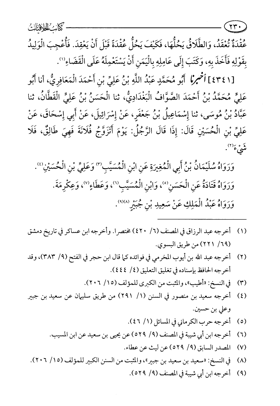[4341] أخبرنا أَبُو مُحَمَّدٍ عَبْدُ اللَّهِ بْنُ عَلِيِّ بْنِ أَحْمَدَ الْمَعَافِرِيُّ، أنا أَبُو عَلِيٍّ مُحَمَّدُ بْنُ أَحْمَدَ الصَّوَّافُ الْبَغْدَادِيُّ، ثنا الْحَسَنُ بْنُ عَلِيٍّ الْقَطَّانُ، ثنا عَبَّادُ بْنُ مُوسَى، ثنا إِسْمَاعِيلُ بْنُ جَعْفَرٍ، عَنْ إِسْرَائِيلَ، عَنْ أَبِي إِسْحَاقَ، عَنْ عَلِيِّ بْنِ الْحُسَيْنِ قَالَ: إِذَا قَالَ الرَّجُلُ: يَوْمَ أَتَزَوَّجُ فُلَانَةَ فَهِيَ طَالِقٌ، فَلَا شَيْءَ (¬2).