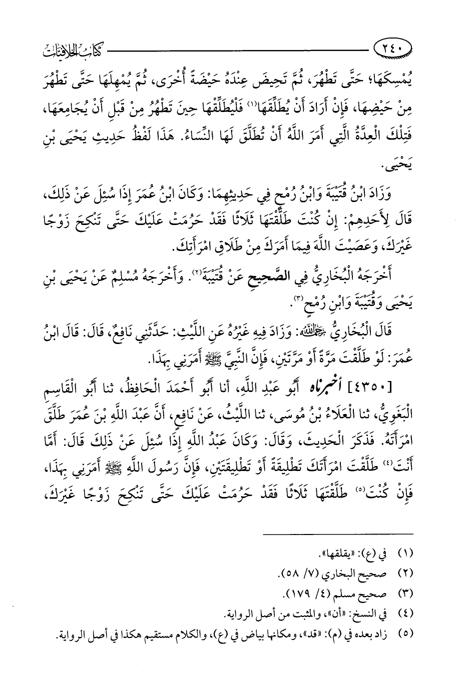 [4350] أخبرناه أَبُو عَبْدِ اللَّهِ، أنا أَبُو أَحْمَدَ الْحَافِظُ، ثنا أَبُو الْقَاسِمِ الْبَغَوِيُّ، ثنا الْعَلَاءُ بْنُ مُوسَى، ثنا اللَّيْثُ، عَنْ نَافِعٍ، أَنَّ عَبْدَ اللَّهِ بْنَ عُمَرَ طَلَّقَ امْرَأَتَهُ. فَذَكَرَ الْحَدِيثَ، وَقَالَ: وَكَانَ عَبْدُ اللَّهِ إِذَا سُئِلَ عَنْ ذَلِكَ قَالَ: أَمَّا أَنْتَ (¬4) طَلَّقْتَ امْرَأَتَكَ تَطْلِيقَةً أَوْ تَطْلِيقَتَيْنِ، فَإِنَّ رَسُولَ اللَّهِ - صلى الله عليه وسلم - أَمَرَنِي بِهَذَا، فَإِنْ كُنْتَ (¬5) طَلَّقْتَهَا ثَلَاثًا فَقَدْ حَرُمَتْ عَلَيْكَ حَتَّى تَنْكِحَ زَوْجًا غَيْرَكَ،