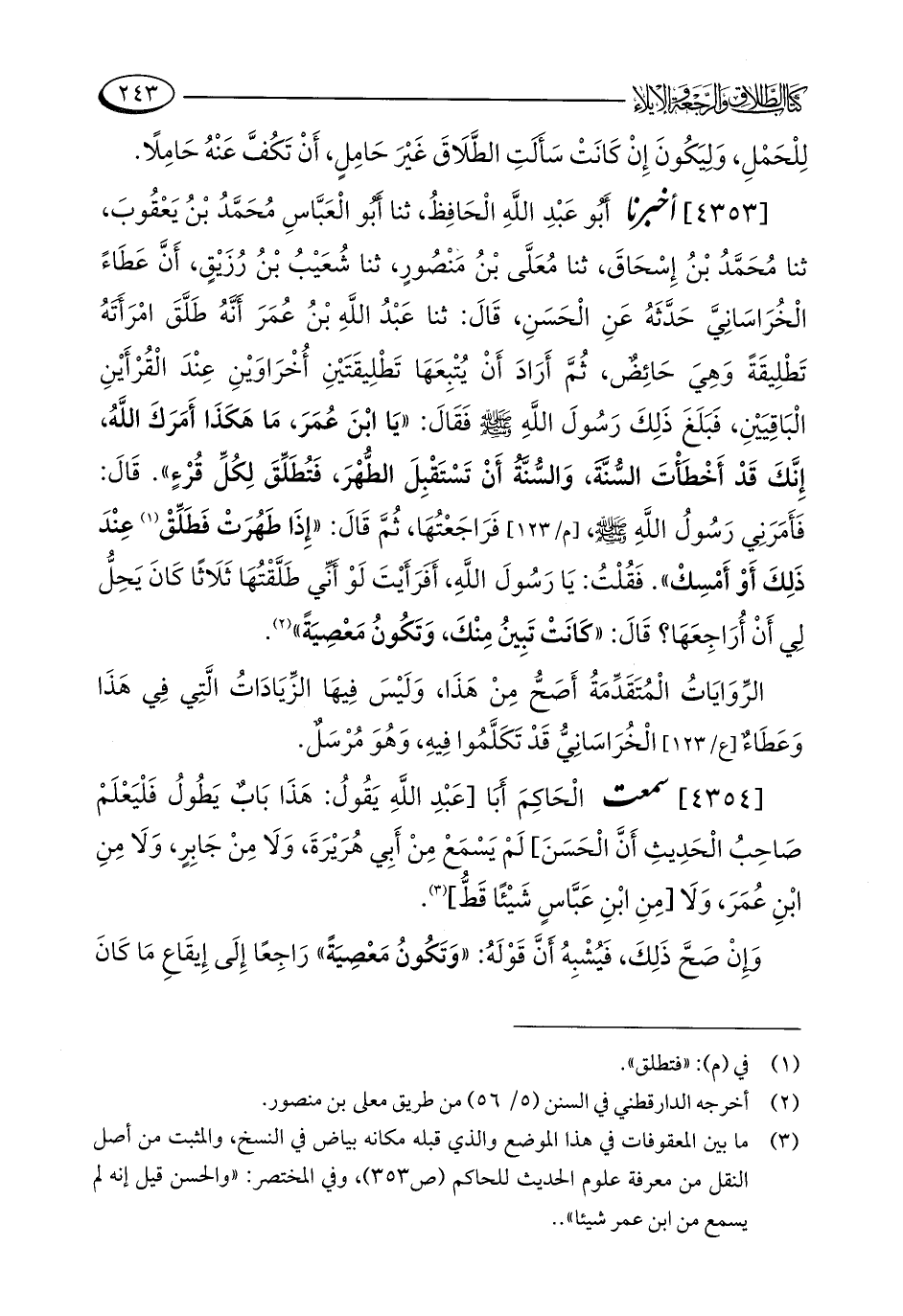 [4353] أخبرنا أَبُو عَبْدِ اللَّهِ الْحَافِظُ، ثنا أَبُو الْعَبَّاسِ مُحَمَّدُ بْنُ يَعْقُوبَ، ثنا مُحَمَّدُ بْنُ إِسْحَاقَ، ثنا مُعَلَّى بْنُ مَنْصُورٍ، ثنا شُعَيْبُ بْنُ رُزَيْقٍ، أَنَّ عَطَاءً الْخُرَاسَانِيَّ حَدَّثَهُ عَنِ الْحَسَنِ، قَالَ: ثنا عَبْدُ اللَّهِ بْنُ عُمَرَ أَنَّهُ طَلَّقَ امْرَأَتَهُ تَطْلِيقَةً وَهِيَ حَائِضٌ، ثُمَّ أَرَادَ أَنْ يُتْبِعَهَا تَطْلِيقَتَيْنِ أُخْرَاوَيْنِ عِنْدَ الْقُرْأَيْنِ الْبَاقِيَيْنِ، فَبَلَغَ ذَلِكَ رَسُولَ اللَّهِ - صلى الله عليه وسلم - فَقَالَ: "يَا ابْنَ عُمَرَ، مَا هَكَذَا أَمَرَكَ اللَّهُ، إِنَّكَ قَدْ أَخْطَأْتَ السُّنَّةَ، وَالسُّنَّةُ أَنْ تَسْتَقْبِلَ الطُّهْرَ، فَتُطَلِّقَ لِكُلِّ قُرْءٍ". قَالَ: فَأَمَرَنِي رَسُولُ اللَّهِ - صلى الله عليه وسلم - فَرَاجَعْتُهَا، ثُمَّ قَالَ: "إِذَا طَهُرَتْ فَطَلِّقْ (¬1) عِنْدَ ذَلِكَ أَوْ أَمْسِكْ". فَقُلْتُ: يَا رَسُولَ اللَّهِ، أَفَرَأَيْتَ لَوْ أَنِّي طَلَّقْتُهَا ثَلَاثًا كَانَ يَحِلُّ لِي أَنْ أُرَاجِعَهَا؟ قَالَ: "كانَتْ تَبِينُ مِنْكَ، وَتَكُونُ مَعْصِيَةً" (¬2).