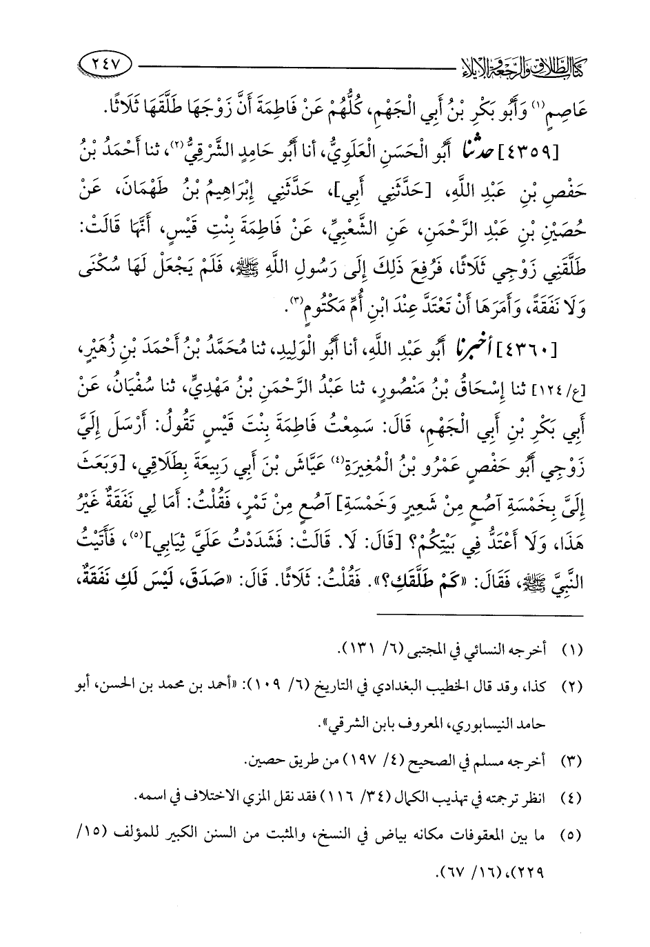 [4360] أخبرنا أَبُو عَبْدِ اللَّهِ، أنا أَبُو الْوَلِيدِ، ثنا مُحَمَّدُ بْنُ أَحْمَدَ بْنِ زُهَيْرٍ، ثنا إِسْحَاقُ بْنُ مَنْصُورٍ، ثنا عَبْدُ الرَّحْمَنِ بْنُ مَهْدِيٍّ، ثنا سُفْيَانُ، عَنْ أَبِي بَكْرِ بْنِ أَبِي الْجَهْمِ، قَالَ: سَمِعْتُ فَاطِمَةَ بِنْتَ قَيْسٍ تَقُولُ: أَرْسَلَ إِلَيَّ زَوْجِي أَبُو حَفْصٍ عَمْرُو بْنُ الْمُغِيرَةِ (¬4) عَيَّاشَ بْنَ أَبِي رَبِيعَةَ بِطَلَاقِي، [وَبَعَثَ إِلَيَّ بِخَمْسَةِ آصُعٍ مِنْ شَعِيرٍ وَخَمْسَةِ] آصُعٍ مِنْ تَمْرٍ، فَقُلْتُ: أَمَا لِي نَفَقَةٌ غَيْرُ هَذَا، وَلَا أَعْتَدُّ فِي بَيْتِكُمْ؟ [قَالَ: لَا. قَالَتْ: فَشَدَدْتُ عَلَيَّ ثِيَابِي] (¬5)، فَأَتَيْتُ النَّبِيَّ - صلى الله عليه وسلم -، فَقَالَ: "كَمْ طَلَّقَكِ؟ ". فَقُلْتُ: ثَلَاثًا. قَالَ: "صَدَقَ، لَيْسَ لَكِ نَفَقَةٌ،