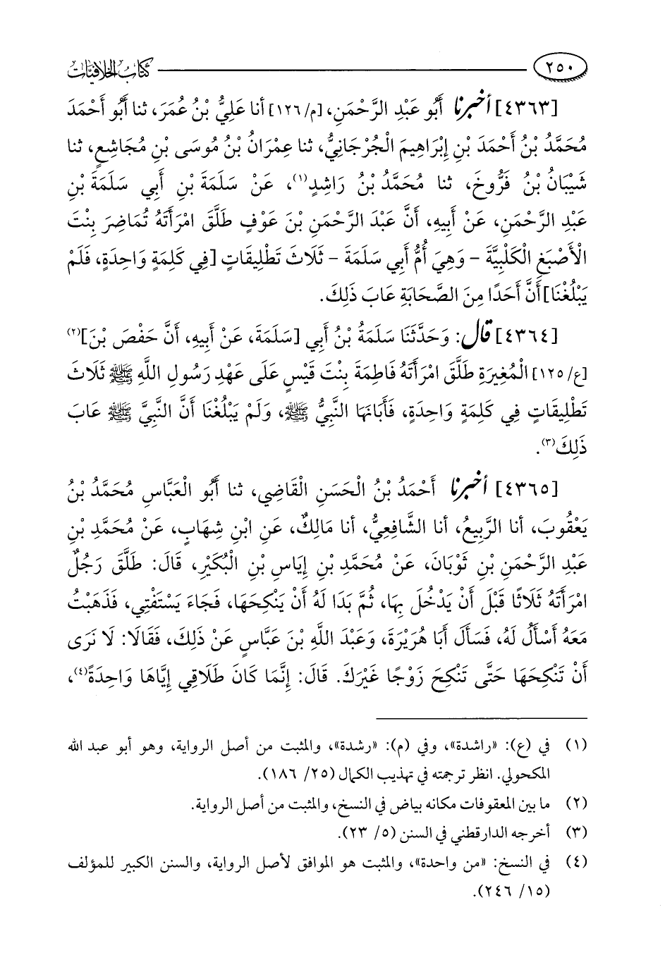 [4363] أخبرنا أَبُو عَبْدِ الرَّحْمَنِ، أنا عَلِيُّ بْنُ عُمَرَ، ثنا أَبُو أَحْمَدَ مُحَمَّدُ بْنُ أَحْمَدَ بْنِ إِبْرَاهِيمَ الْجُرْجَانِيُّ، ثنا عِمْرَانُ بْنُ مُوسى بْنِ مُجَاشِعٍ، ثنا شَيْبَانُ بْنُ فَرُّوخَ، ثنا مُحَمَّدُ بْنُ رَاشِدٍ (¬1)، عَنْ سَلَمَةَ بْنِ أَبِي سَلَمَةَ بْنِ عَبْدِ الرَّحْمَنِ، عَنْ أَبِيهِ، أَنَّ عَبْدَ الرَّحْمَنِ بْنَ عَوْفٍ طَلَّقَ امْرَأَتَهُ تُمَاضِرَ بِنْتَ الْأَصْبَغِ الْكَلْبِيَّةَ - وَهِيَ أُمُّ أَبِي سَلَمَةَ - ثَلَاثَ تَطْلِيقَاتٍ [فِي كَلِمَةٍ وَاحِدَةٍ، فَلَمْ يَبْلُغْنَا] أَنَّ أَحَدًا مِنَ الصَّحَابَةِ عَابَ ذَلِكَ.