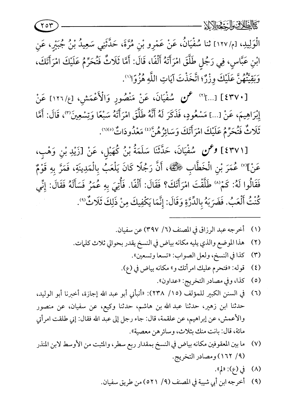 (¬6) في السنن الكبير للمؤلف (15/ 238): "أنبأني أبو عبد الله إجازة، أخبرنا أبو الوليد، حدثنا ابن زهير، حدثنا عبد الله بن هاشم، حدثنا وكيع، عن سفيان، عن منصور والأعمش، عن إبراهيم، عن علقمة، قال: جاء رجل إلى عبد الله فقال: إني طلقت امرأتي مائة، قال: بانت منك بثلاث، وسائرهن معصية".