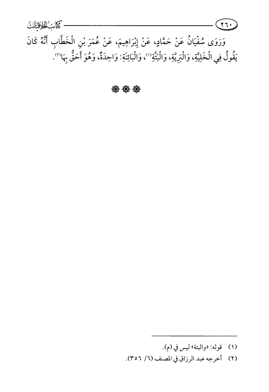 وَرَوَى سُفْيَانُ عَنْ حَمَّادٍ، عَنْ إِبْرَاهِيمَ، عَنْ عُمَرَ بْنِ الْخَطَّابِ أَنَّهُ كَانَ يَقُولُ فِي الْخَلِيَّةِ، وَالْبَرِيَّةِ، وَالْبَتَّةِ (¬1)، وَالْبَائِنَةِ: وَاحِدَةٌ، وَهُوَ أَحَقُّ بِهَا (¬2).