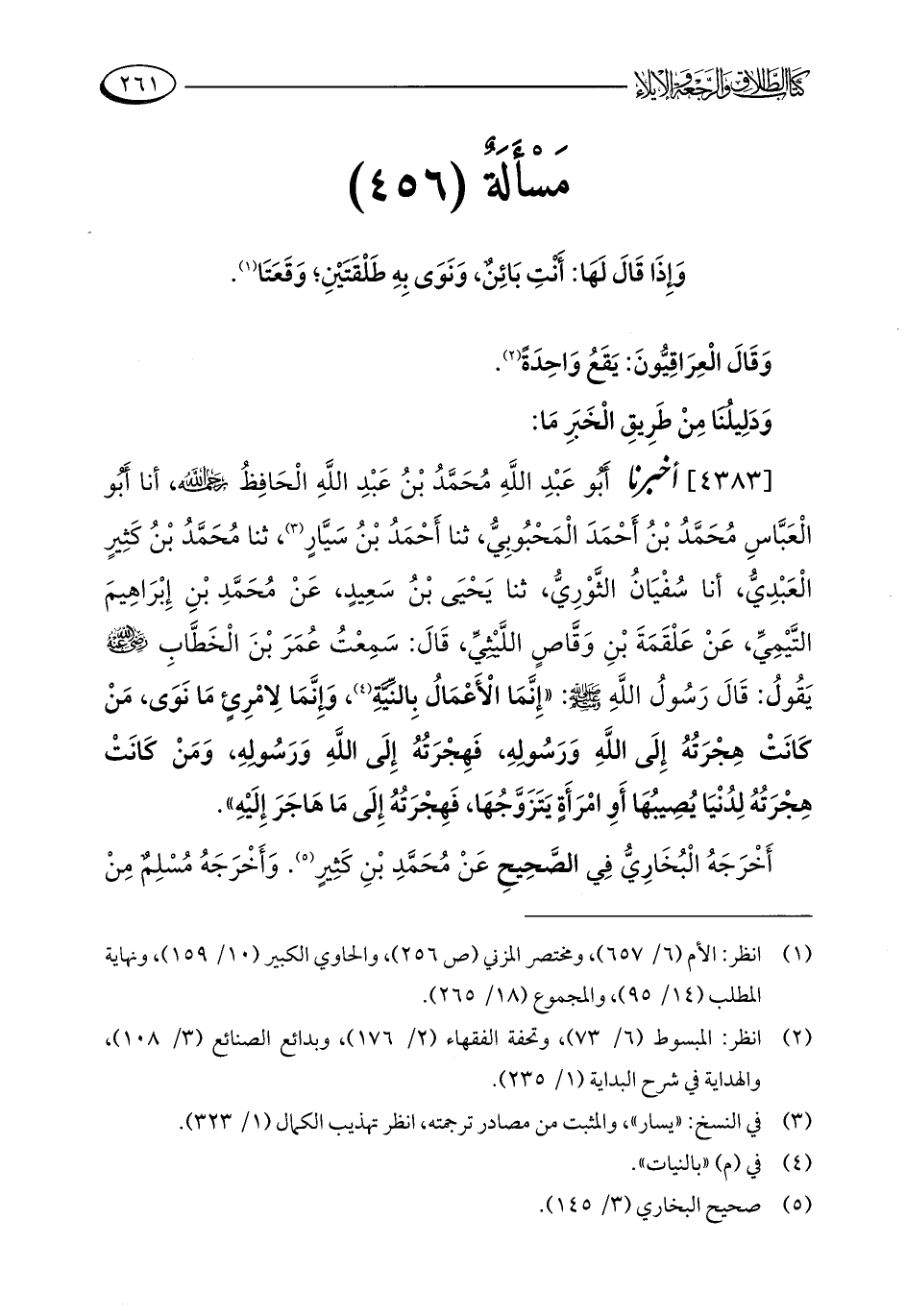 [4383] أخبرنا أَبُو عَبْدِ اللَّهِ مُحَمَّدُ بْنُ عَبْدِ اللَّهِ الْحَافِظُ - رحمه الله -، أنا أَبُو الْعَبَّاسِ مُحَمَّدُ بْنُ أَحْمَدَ الْمَحْبُوبِيُّ، ثنا أَحْمَدُ بْنُ سَيَّارٍ (¬3)، ثنا مُحَمَّدُ بْنُ كَثِيرٍ الْعَبْدِيُّ، أنا سُفْيَانُ الثَّوْرِيُّ، ثنا يَحْيَى بْنُ سَعِيدٍ، عَنْ مُحَمَّدِ بْنِ إِبْرَاهِيمَ التَّيْمِيِّ، عَنْ عَلْقَمَةَ بْنِ وَقَّاصٍ اللَّيْثِيِّ، قَالَ: سَمِعْتُ عُمَرَ بْنَ الْخَطَّابِ - رضي الله عنه - يَقُولُ: قَالَ رَسُولُ اللَّهِ - صلى الله عليه وسلم -: "إِنَّمَا الْأَعْمَالُ بِالنِّيَّةِ (¬4)، وَإِنَّمَا لِامْرِئٍ مَا نَوَى، مَنْ كانَتْ هِجْرَتُهُ إِلَى اللَّهِ وَرَسُولِهِ، فَهِجْرَتُهُ إِلَى اللَّهِ وَرَسُولهِ، وَمَنْ كانَتْ هِجْرَتُهُ لِدُنْيَا يُصِيبُهَا أَوِ امْرَأَةٍ يَتَزَوَّجُهَا، فَهِجْرَتُهُ إِلَى مَا هَاجَرَ إِلَيْهِ".