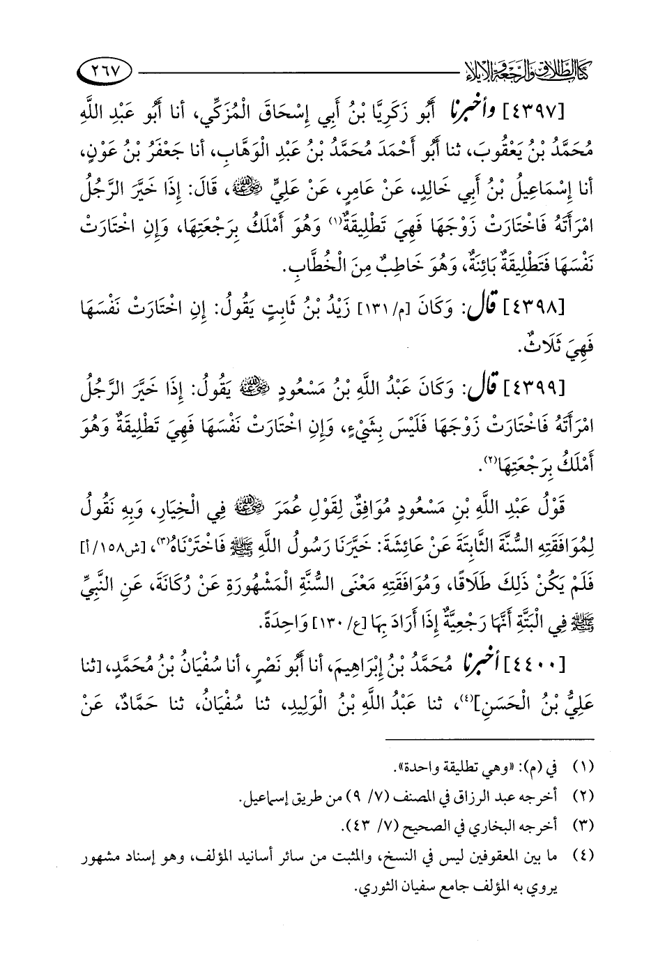 [4399] قال: وَكَانَ عَبْدُ اللَّهِ بْنُ مَسْعُودٍ - رضي الله عنه - يَقُولُ: إِذَا خَيَّرَ الرَّجُلُ امْرَأَتَهُ فَاخْتَارَتْ زَوْجَهَا فَلَيْسَ بِشَيْءٍ، وَإِنِ اخْتَارَتْ نَفْسَهَا فَهِيَ تَطْلِيقَةٌ وَهُوَ أَمْلَكُ بِرَجْعَتِهَا (¬2).