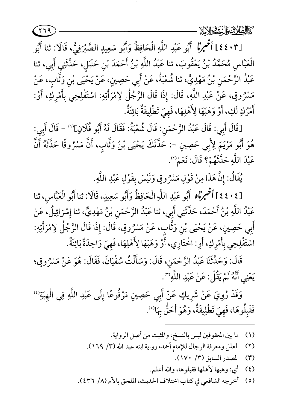 [4403] أخبرنا أَبُو عَبْدِ اللَّهِ الْحَافِظُ وَأَبُو سَعِيدٍ الصَّيْرَفِيُّ، قَالَا: ثنا أَبُو الْعَبَّاسِ مُحَمَّدُ بْنُ يَعْقُوبَ، ثنا عَبْدُ اللَّهِ بْنُ أَحْمَدَ بْنِ حَنْبَلٍ، حَدَّثَنِي أَبِي، ثنا عَبْدُ الرَّحْمَنِ بْنُ مَهْدِيٍّ، ثنا شُعْبَةُ، عَنْ أَبِي حَصِينٍ، عَنْ يَحْيَى بْنِ وَثَّابٍ، عَنْ مَسْرُوقٍ، عَنْ عَبْدِ اللَّهِ، قَالَ: إِذَا قَالَ الرَّجُلُ لِامْرَأَتِهِ: اسْتَفْلِحِي بِأَمْرِكِ، أَوْ: أَمْرُكِ لَكِ، أَوْ وَهَبَهَا لِأَهْلِهَا، فَهِيَ تَطْلِيقَةٌ بَائِنَةٌ.