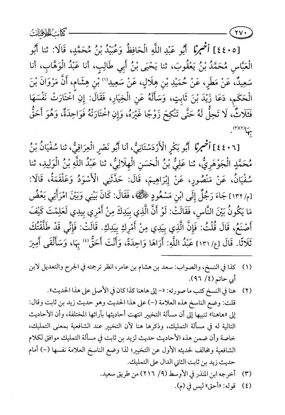 [4405] أخبرنا أَبُو عَبْدِ اللَّهِ الْحَافِظُ وَعُبَيْدُ بْنُ مُحَمَّدٍ، قَالَا: ثنا أَبُو الْعَبَّاسِ مُحَمَّدُ بْنُ يَعْقُوبَ، ثنا يَحْيَى بْنُ أَبِي طَالِبٍ، أنا عَبْدُ الْوَهَّابِ، أنا سَعِيدٌ، عَنْ مَطَرٍ، عَنْ حُمَيْدِ بْنِ هِلَالٍ، عَنْ سَعِيدِ (¬1) بْنِ هِشَامٍ، أَنَّ مَرْوَانَ بْنَ الْحَكَمِ، دَعَا زَيْدَ بْنَ ثَابِتٍ، وَسَأَلَهُ عَنِ الْخِيَارِ، فَقَالَ: إِنِ اخْتَارَتْ نَفْسَهَا فَثَلَاثٌ، لَا تَحِلُّ لَهُ حَتَّى تَنْكِحَ زَوْجًا غَيْرَهُ، وَإِنِ اخْتَارَتْهُ فَوَاحِدَةٌ، وَهُوَ أَحَقُّ بِهَا (¬2) (¬3).