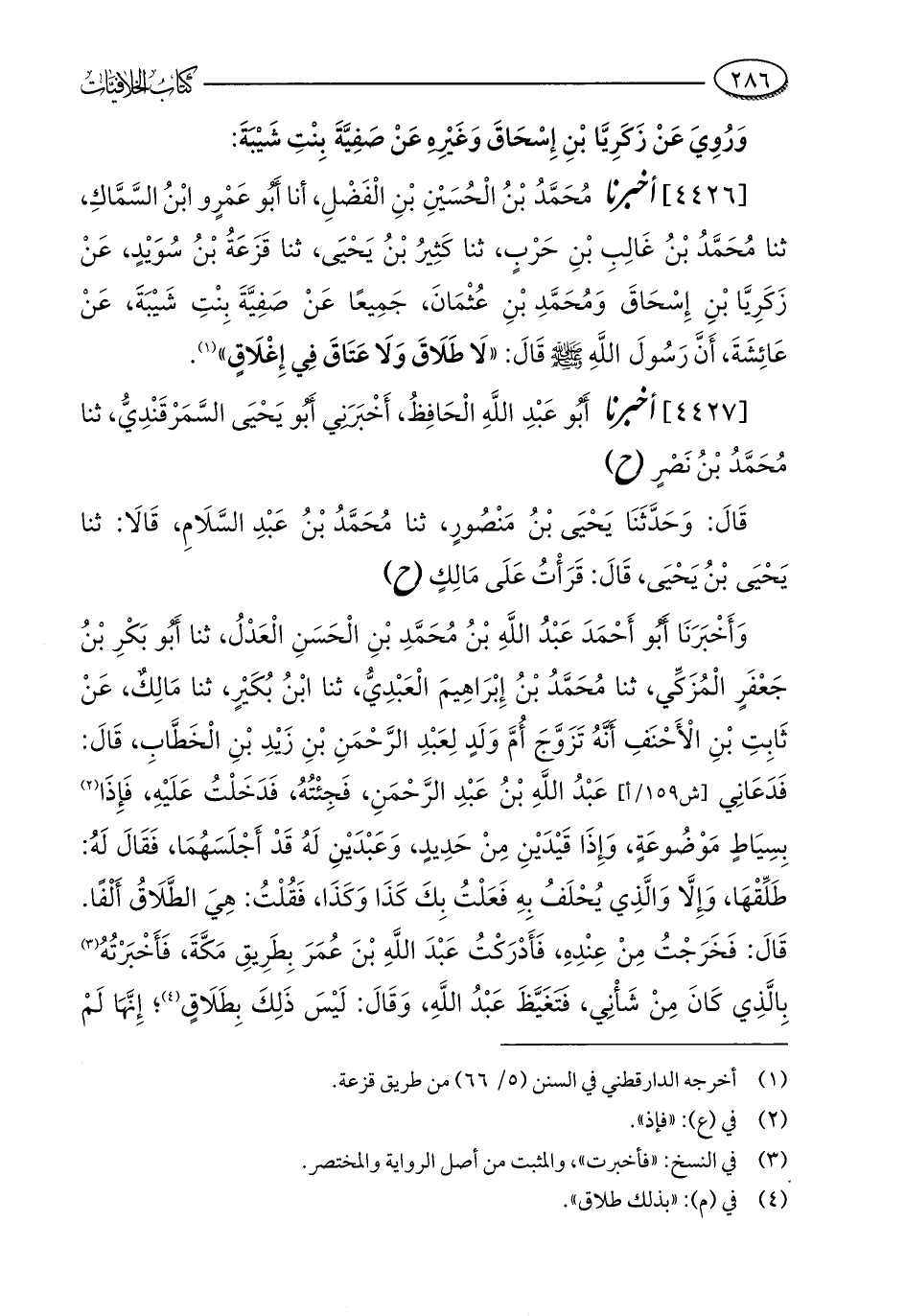 [4426] أخبرنا مُحَمَّدُ بْنُ الْحُسَيْنِ بْنِ الْفَضْلِ، أنا أَبُو عَمْرٍ وابْنُ السَّمَّاكِ، ثنا مُحَمَّدُ بْنُ غَالِبِ بْنِ حَرْبٍ، ثنا كَثِيرُ بْنُ يَحْيَى، ثنا قَزَعَةُ بْنُ سُوَيْدٍ، عَنْ زَكَرِيَّا بْنِ إِسْحَاقَ وَمُحَمَّدِ بْنِ عُثْمَانَ، جَمِيعًا عَنْ صَفِيَّةَ بِنْتِ شَيْبَةَ، عَنْ عَائِشَةَ، أَنَّ رَسُولَ اللَّهِ - صلى الله عليه وسلم - قَالَ: "لَا طَلَاقَ وَلَا عَتَاقَ فِي إِغْلَاقٍ" (¬1).