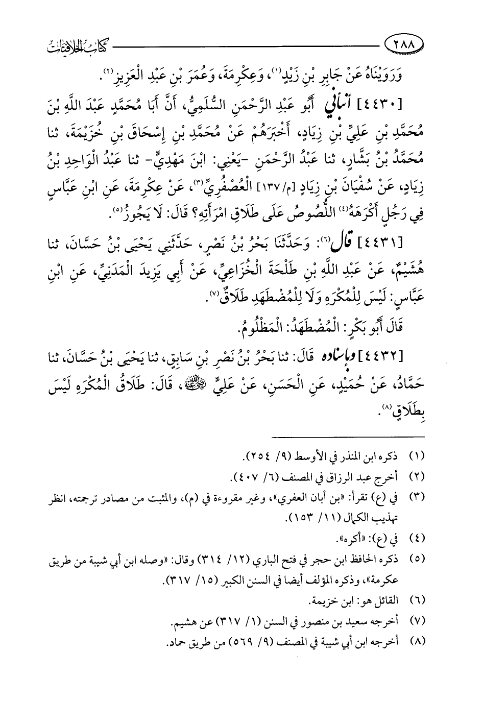 [4431] قال (¬6): وَحَدَّثَنَا بَحْرُ بْنُ نَصْرٍ، حَدَّثَنِي يَحْيَى بْنُ حَسَّانَ، ثنا هُشَيْمٌ، عَنْ عَبْدِ اللَّهِ بْنِ طَلْحَةَ الْخُزَاعِيِّ، عَنْ أَبِي يَزِيدَ الْمَدَنِيِّ، عَنِ ابْنِ عَبَّاسٍ: لَيْسَ لِلْمُكْرَهِ وَلَا لِلْمُضْطَهَدِ طَلَاقٌ (¬7).