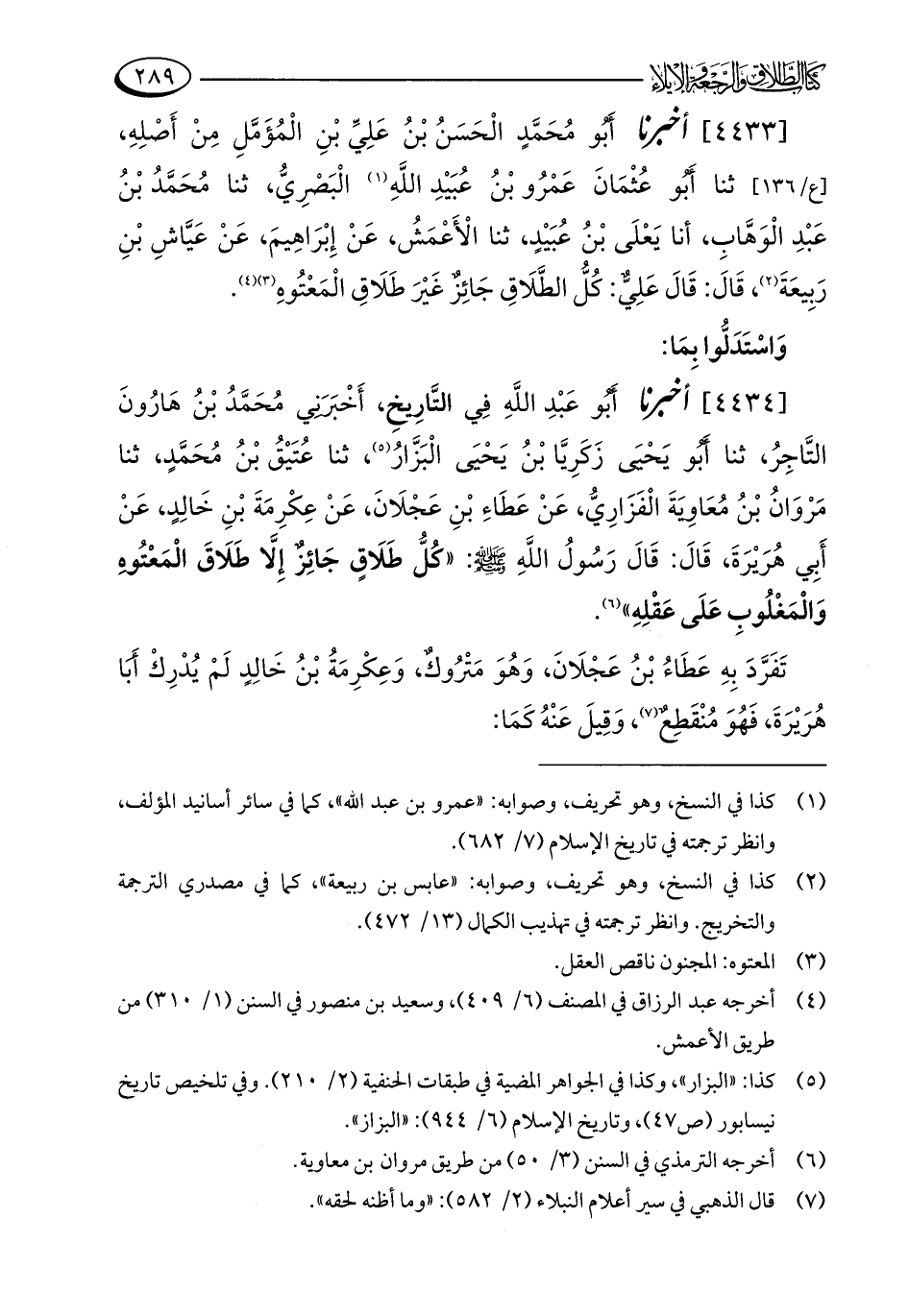 [4434] أخبرنا أَبُو عَبْدِ اللَّهِ فِي التَّارِيخِ، أَخْبَرَنِي مُحَمَّدُ بْنُ هَارُونَ التَّاجِرُ، ثنا أَبُو يَحْيَى زَكَرِيَّا بْنُ يَحْيَى الْبَزَّارُ (¬5)، ثنا عُتَيْقُ بْنُ مُحَمَّدٍ، ثنا مَرْوَانُ بْنُ مُعَاوِيةَ الْفَزَارِيُّ، عَنْ عَطَاءِ بْنِ عَجْلَانَ، عَنْ عِكْرِمَةَ بْنِ خَالِدٍ، عَنْ أَبِي هُرَيْرَةَ، قَالَ: قَالَ رَسُولُ اللَّهِ - صلى الله عليه وسلم -: "كُلُّ طَلَاقٍ جَائِزٌ إِلَّا طَلَاقَ الْمَعْتُوهِ وَالْمَغْلُوبِ عَلَى عَقْلِهِ" (¬6).