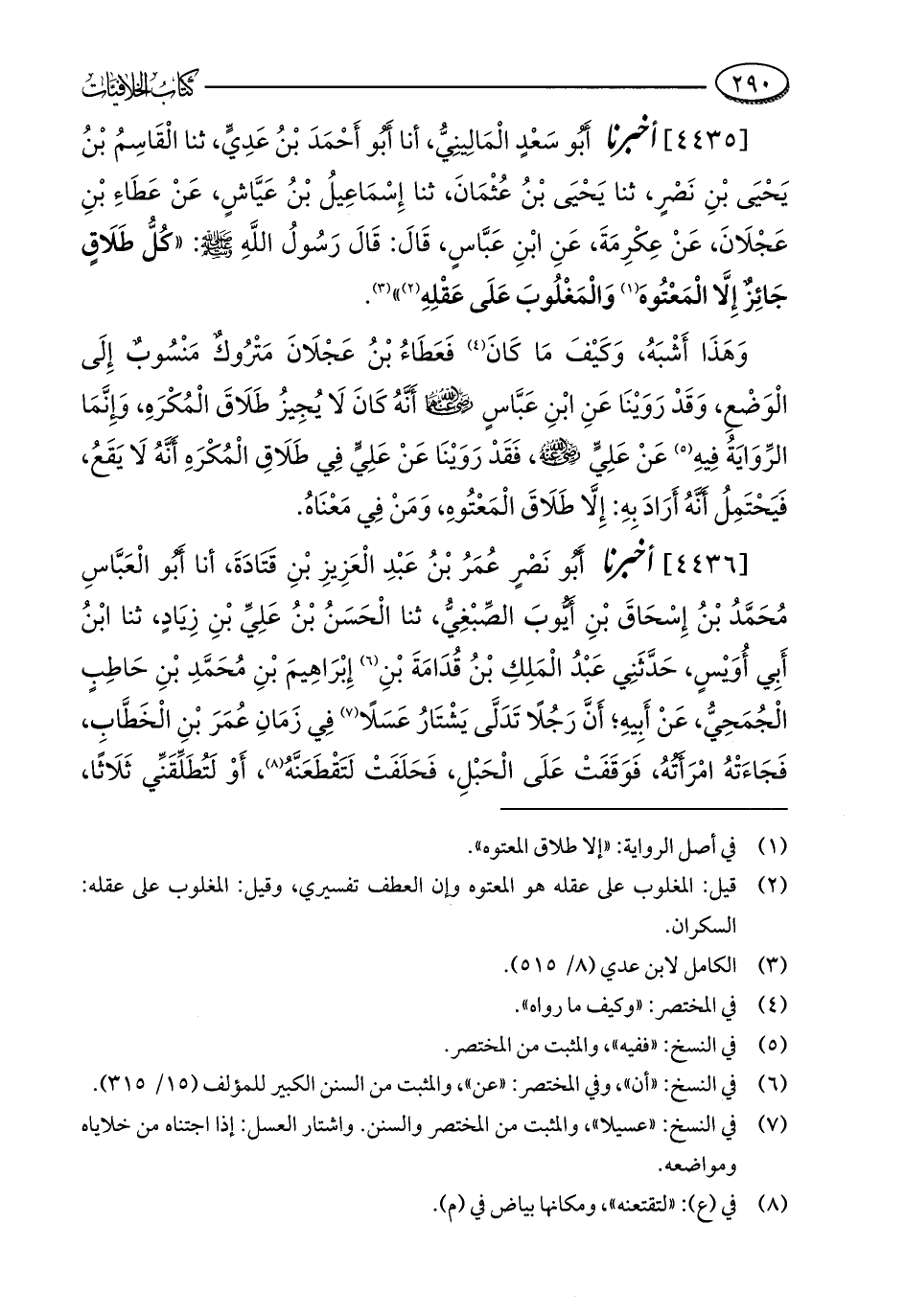 [4435] أخبرنا أَبُو سعْدٍ الْمَالِينِيُّ، أنا أَبُو أَحْمَدَ بْنُ عَدِيٍّ، ثنا الْقَاسِمُ بْنُ يَحْيَى بْنِ نَصْرٍ، ثنا يَحْيَى بْنُ عُثْمَانَ، ثنا إِسْمَاعِيلُ بْنُ عَيَّاشٍ، عَنْ عَطَاءِ بْنِ عَجْلَانَ، عَنْ عِكْرِمَةَ، عَنِ ابْنِ عَبَّاسٍ، قَالَ: قَالَ رَسُولُ اللَّهِ - صلى الله عليه وسلم -: "كُلُّ طَلَاقٍ جَائِز إِلَّا الْمَعْتُوهَ (¬1) وَالْمَغْلُوبَ عَلَى عَقْلِهِ (¬2) " (¬3).