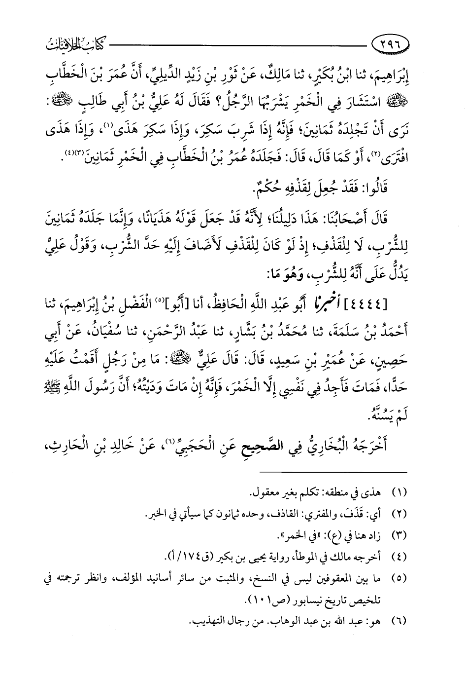 إِبْرَاهِيمَ، ثنا ابْنُ بُكَيْرٍ، ثنا مَالِكٌ، عَنْ ثَوْرِ بْنِ زَيْدٍ الدِّيلِيِّ، أَنَّ عُمَرَ بْنَ الْخَطَّابِ - رضي الله عنه - اسْتَشَارَ فِي الْخَمْرِ يَشْرَبُهَا الرَّجُلُ؟ فَقَالَ لَهُ عَلِيُّ بْنُ أَبِي طَالِبٍ - رضي الله عنه -: نَرَى أَنْ تَجْلِدَهُ ثَمَانِينَ؛ فَإِنَّهُ إِذَا شَرِبَ سَكِرَ، وَإِذَا سَكِرَ هَذَى (¬1)، وَإِذَا هَذَى افْتَرَى (¬2)، أَوْ كَمَا قَالَ، قَالَ: فَجَلَدَهُ عُمَرُ بْنُ الْخَطَّابِ فِي الْخَمْرِ ثَمَانِينَ (¬3) (¬4).