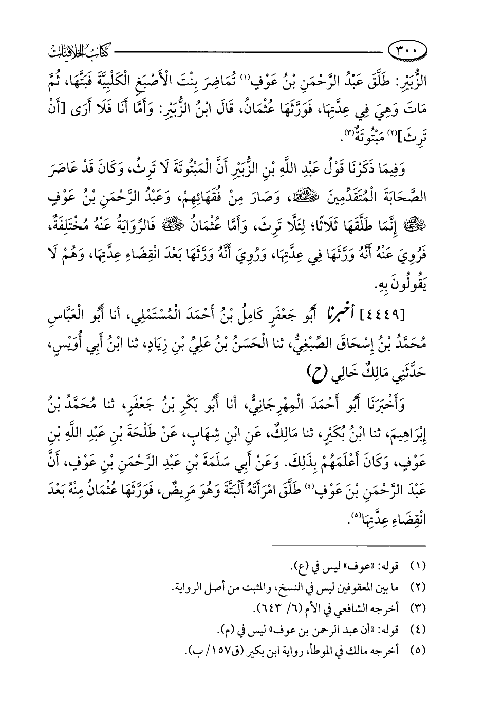 وَأَخْبَرَنَا أَبُو أَحْمَدَ الْمِهْرِجَانِيُّ، أنا أَبُو بَكْرِ بْنُ جَعْفَرٍ، ثنا مُحَمَّدُ بْنُ إِبْرَاهِيمَ، ثنا ابْنُ بُكَيْرٍ، ثنا مَالِكٌ، عَنِ ابْنِ شِهَابٍ، عَنْ طَلْحَةَ بْنِ عَبْدِ اللَّهِ بْنِ عَوْفٍ، وَكَانَ أَعْلَمَهُمْ بِذَلِكَ. وَعَنْ أَبِي سَلَمَةَ بْنِ عَبْدِ الرَّحْمَنِ بْنِ عَوْفٍ، أَنَّ عَبْدَ الرَّحْمَنِ بْنَ عَوْفٍ (¬4) طَلَّقَ امْرَأَتَهُ أَلْبَتَّةَ وَهُوَ مَرِيضٌ، فَوَرَّثَهَا عُثْمَانُ مِنْهُ بَعْدَ انْقِضَاءِ عِدَّتِهَا (¬5).