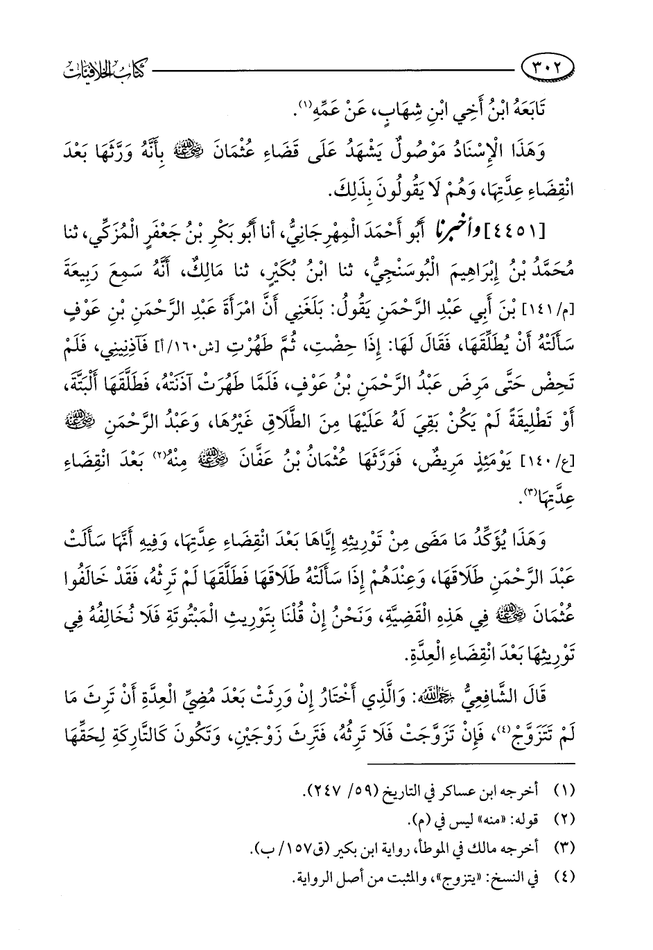 [4451] وأخبرنا أَبُو أَحْمَدَ الْمِهْرِجَانِيُّ، أنا أَبُو بَكْرِ بْنُ جَعْفَرٍ الْمُزَكِّي، ثنا مُحَمَّدُ بْنُ إِبْرَاهِيمَ الْبُوسَنْجِيُّ، ثنا ابْنُ بُكَيْرٍ، ثنا مَالِكٌ، أَنَّهُ سَمِعَ رَبِيعَةَ بْنَ أَبِي عَبْدِ الرَّحْمَنِ يَقُولُ: بَلَغَنِي أَنَّ امْرَأَةَ عَبْدِ الرَّحْمَنِ بْنِ عَوْفٍ سَأَلَتْهُ أَنْ يُطَلِّقَهَا، فَقَالَ لَهَا: إِذَا حِضْتِ، ثُمَّ طَهُرْتِ فَآذِنِينِي، فَلَمْ تَحِضْ حَتَّى مَرِضَ عَبْدُ الرَّحْمَنِ بْنُ عَوْفٍ، فَلَمَّا طَهُرَتْ آذَنَتْهُ، فَطَلَّقَهَا أَلْبَتَّةَ، أَوْ تَطْلِيقَةً لَمْ يَكُنْ بَقِيَ لَهُ عَلَيْهَا مِنَ الطَّلَاقِ غَيْرُهَا، وَعَبْدُ الرَّحْمَنِ - رضي الله عنه - يَوْمَئِذٍ مَرِيضٌ، فَوَرَّثَهَا عُثْمَانُ بْنُ عَفَّانَ - رضي الله عنه - مِنْهُ (¬2) بَعْدَ انْقِضَاءِ عِدَّتِهَا (¬3).