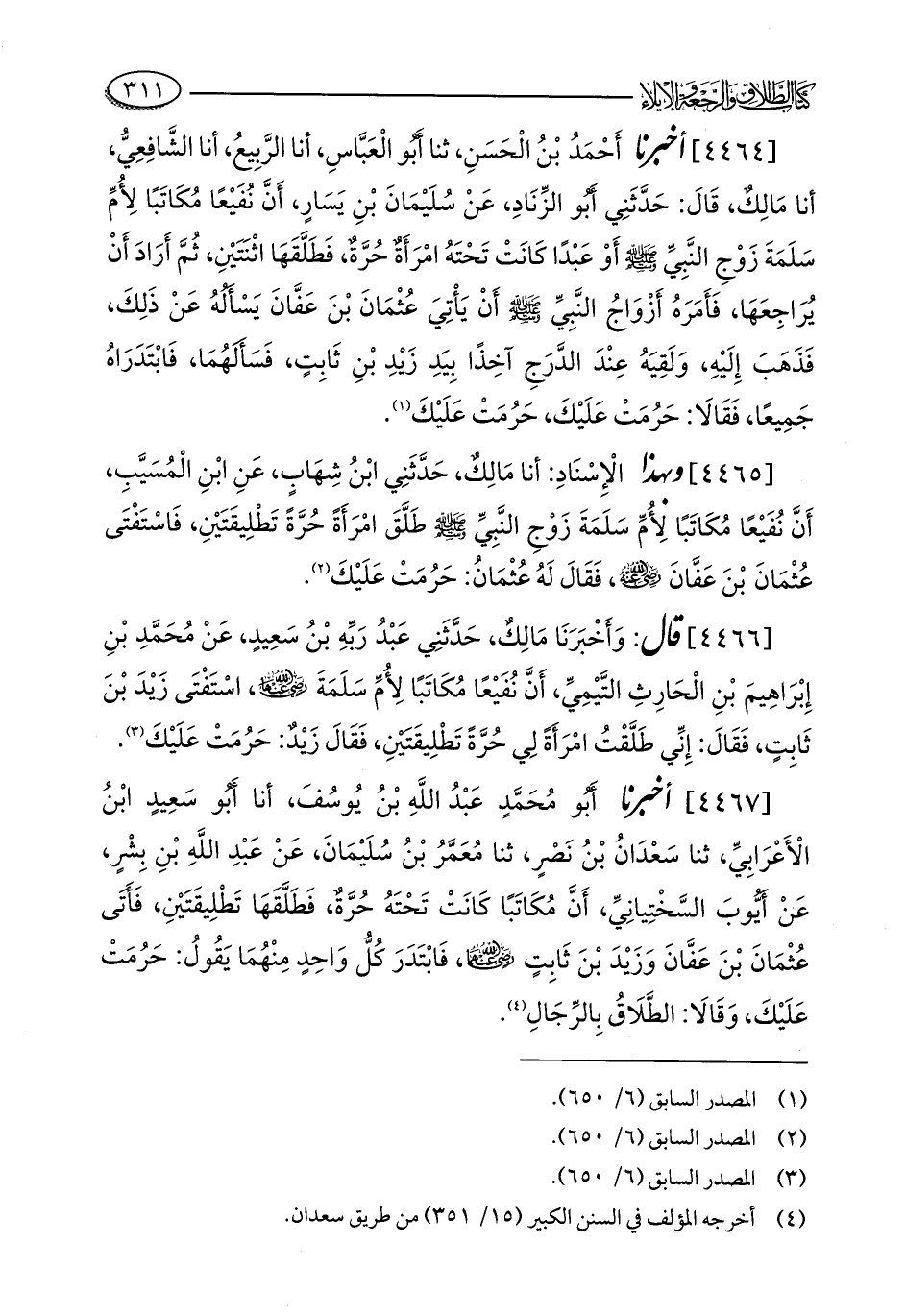 [4464] أخبرنا أَحْمَدُ بْنُ الْحَسَنِ، ثنا أَبُو الْعَبَّاسِ، أنا الرَّبِيعُ، أنا الشَّافِعِيُّ، أنا مَالِكٌ، قَالَ: حَدَّثَنِي أَبُو الزِّنَادِ، عَنْ سُلَيْمَانَ بْنِ يَسَارٍ، أَنَّ نُفَيْعًا مُكَاتَبًا لِأُمِّ سَلَمَةَ زَوْجِ النَّبِيِّ - صلى الله عليه وسلم - أَوْ عَبْدًا كَانَتْ تَحْتَهُ امْرَأَةٌ حُرَّةٌ، فَطَلَّقَهَا اثْنَتَيْنِ، ثُمَّ أَرَادَ أَنْ يُرَاجِعَهَا، فَأَمَرَهُ أَزْوَاجُ النَّبِيِّ - صلى الله عليه وسلم - أَنْ يَأْتِيَ عُثْمَانَ بْنَ عَفَّانَ يَسْأَلُهُ عَنْ ذَلِكَ، فَذَهَبَ إِلَيْهِ، وَلَقِيَهُ عِنْدَ الدَّرَجِ آخِذًا بِيَدِ زَيْدِ بْنِ ثَابِتٍ، فَسَأَلَهُمَا، فَابْتَدَرَاهُ جَمِيعًا، فَقَالَا: حَرُمَتْ عَلَيْكَ، حَرُمَتْ عَلَيْكَ (¬1).