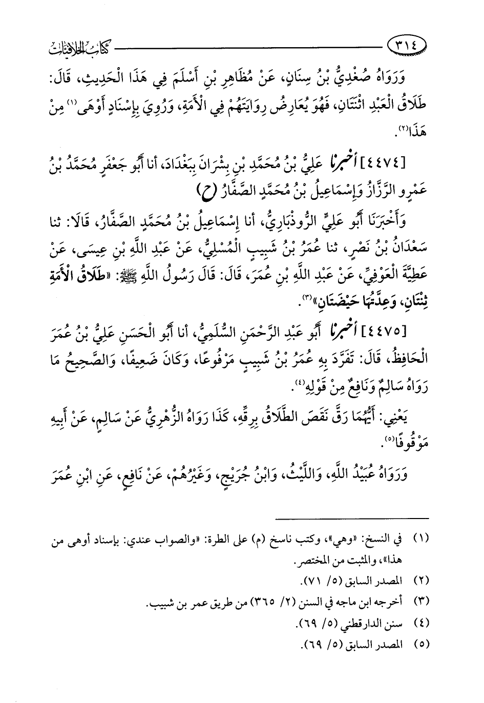 [4475] أخبرنا أَبُو عَبْدِ الرَّحْمَنِ السُّلَمِيُّ، أنا أَبُو الْحَسَنِ عَلِيُّ بْنُ عُمَرَ الْحَافِظُ، قَالَ: تَفَرَّدَ بِهِ عُمَرُ بْنُ شَبِيبٍ مَرْفُوعًا، وَكَانَ ضَعِيفًا، وَالصَّحِيحُ مَا رَوَاهُ سَالِمٌ وَنَافِعٌ مِنْ قَوْلِهِ (¬4).
