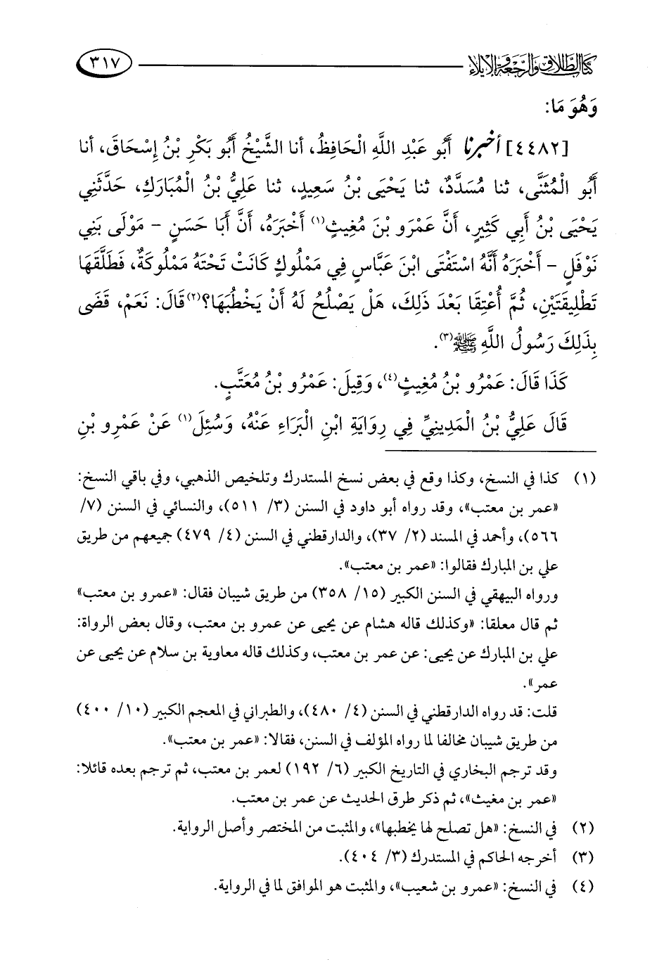 [4482] أخبرنا أَبُو عَبْدِ اللَّهِ الْحَافِظُ، أنا الشَّيْخُ أَبُو بَكْرِ بْنُ إِسْحَاقَ، أنا أَبُو الْمُثَنَّى، ثنا مُسَدَّدٌ، ثنا يَحْيَى بْنُ سَعِيدٍ، ثنا عَلِيُّ بْنُ الْمُبَارَكِ، حَدَّثَنِي يَحْيَى بْنُ أَبِي كَثِيرٍ، أَنَّ عَمْرَو بْنَ مُغِيثٍ (¬1) أَخْبَرَهُ، أَنَّ أَبَا حَسَنٍ - مَوْلَى بَنِي نَوْفَلٍ - أَخْبَرَهُ أَنَّهُ اسْتَفْتَى ابْنَ عَبَّاسٍ فِي مَمْلُوكٍ كَانَتْ تَحْتَهُ مَمْلُوكَةٌ، فَطَلَّقَهَا تَطْلِيقَتَيْنِ، ثُمَّ أُعْتِقَا بَعْدَ ذَلِكَ، هَلْ يَصْلُحُ لَهُ أَنْ يَخْطُبَهَا؟ (¬2) قَالَ: نَعَمْ، قَضَى بِذَلِكَ رَسُولُ اللَّهِ - صلى الله عليه وسلم - (¬3).
