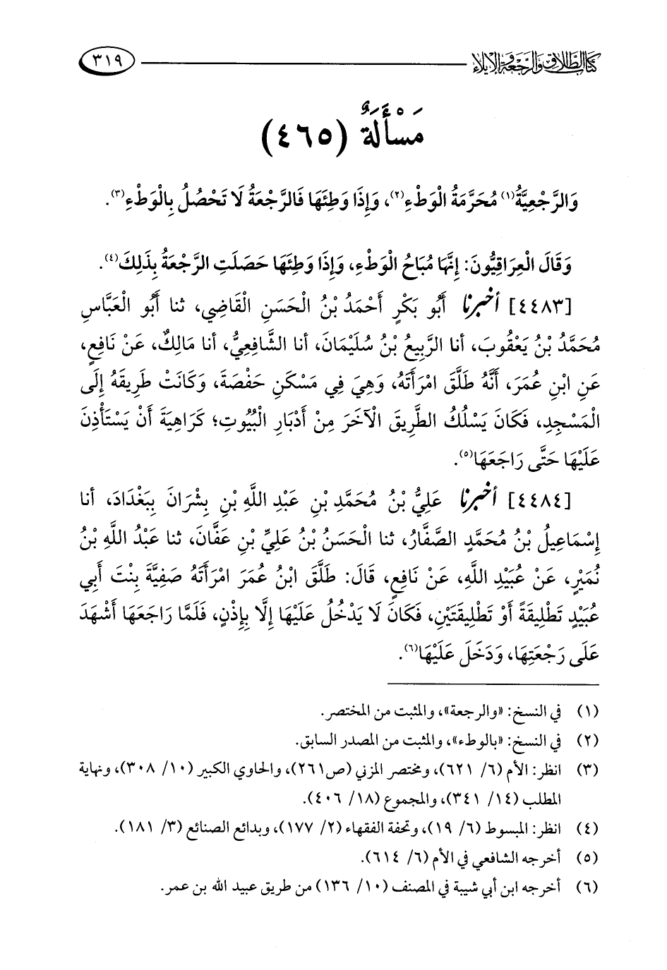 [4484] أخبرنا عَلِيُّ بْنُ مُحَمَّدِ بْنِ عَبْدِ اللَّهِ بْنِ بِشْرَانَ بِبَغْدَادَ، أنا إِسْمَاعِيلُ بْنُ مُحَمَّدٍ الصَّفَّارُ، ثنا الْحَسَنُ بْنُ عَلِيِّ بْنِ عَفَّانَ، ثنا عَبْدُ اللَّهِ بْنُ نُمَيْرٍ، عَنْ عُبَيْدِ اللَّهِ، عَنْ نَافِعٍ، قَالَ: طَلَّقَ ابْنُ عُمَرَ امْرَأَتَهُ صَفِيَّةَ بِنْتَ أَبِي عُبَيْدٍ تَطْلِيقَةً أَوْ تَطْلِيقَتَيْنِ، فَكَانَ لَا يَدْخُلُ عَلَيْهَا إِلَّا بِإِذْنٍ، فَلَمَّا رَاجَعَهَا أَشْهَدَ عَلَى رَجْعَتِهَا، وَدَخَلَ عَلَيْهَا (¬6).