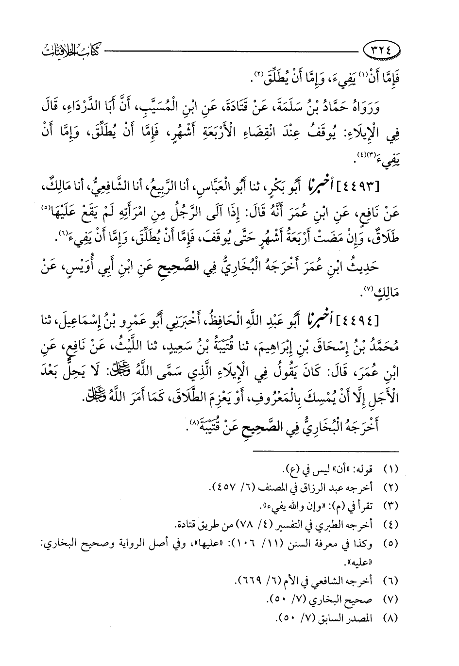 [4493] أخبرنا أَبُو بَكْرٍ، ثنا أَبُو الْعَبَّاسِ، أنا الرَّبِيعُ، أنا الشَّافِعِيُّ، أنا مَالِكٌ، عَنْ نَافِعٍ، عَنِ ابْنِ عُمَرَ أَنَّهُ قَالَ: إِذَا آلَى الرَّجُلُ مِنِ امْرَأَتِهِ لَمْ يَقَعْ عَلَيْهَا (¬5) طَلَاقٌ، وَإِنْ مَضَتْ أَرْبَعَةُ أَشْهُرٍ حَتَّى يُوقَفَ، فَإِمَّا أَنْ يُطَلِّقَ، وَإِمَّا أَنْ يَفِيءَ (¬6).