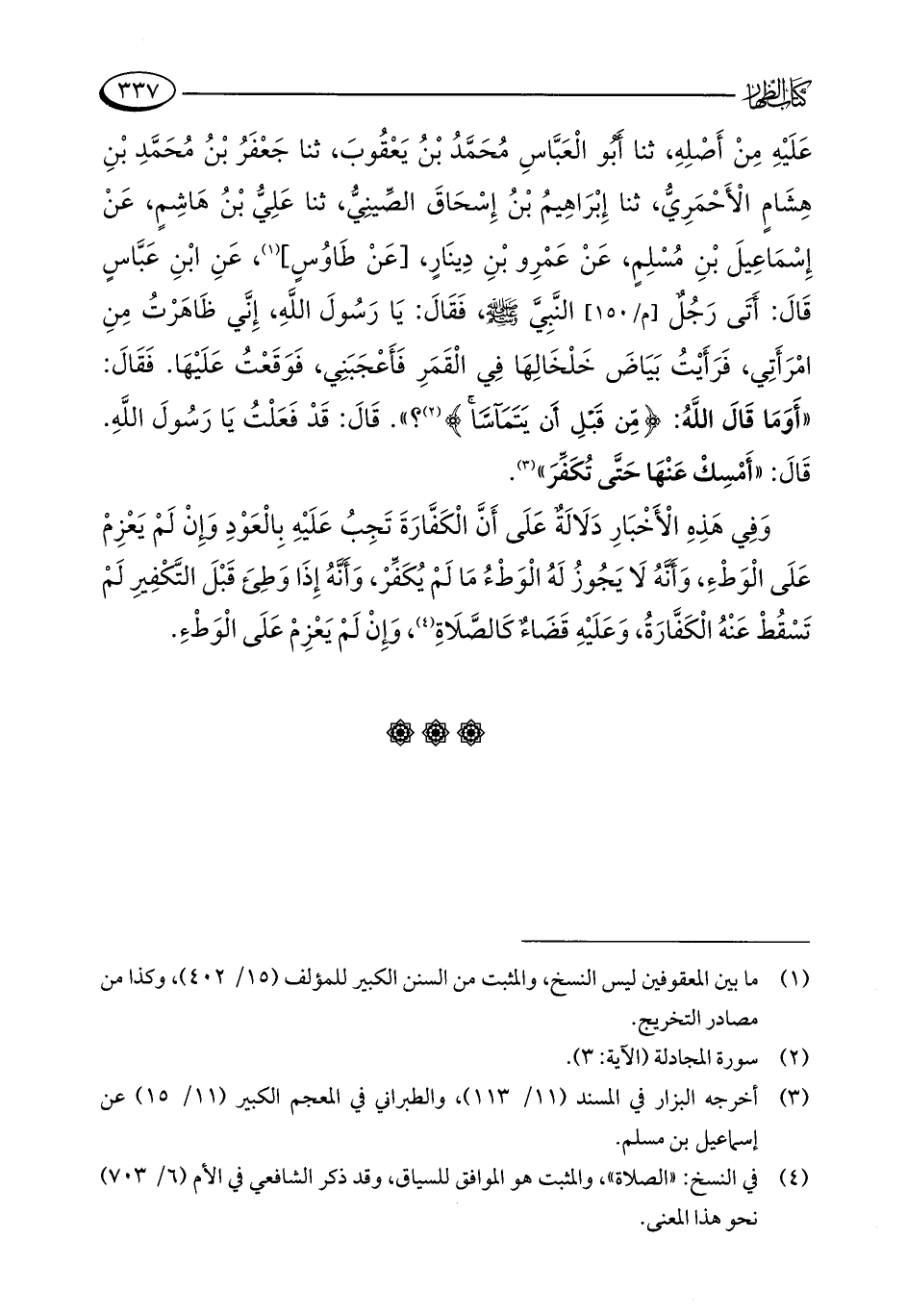عَلَيْهِ مِنْ أَصْلِهِ، ثنا أَبُو الْعَبَّاسِ مُحَمَّدُ بْنُ يَعْقُوبَ، ثنا جَعْفَرُ بْنُ مُحَمَّدِ بْنِ هِشَامٍ الْأَحْمَرِيُّ، ثنا إِبْرَاهِيمُ بْنُ إِسْحَاقَ الصِّينِيُّ، ثنا عَلِيُّ بْنُ هَاشِمٍ، عَنْ إِسْمَاعِيلَ بْنِ مُسْلِمٍ، عَنْ عَمْرِو بْنِ دِينَارٍ، [عَنْ طَاوُسٍ] (¬1)، عَنِ ابْنِ عَبَّاسٍ قَالَ: أَتَى رَجُلٌ النَّبِيَّ - صلى الله عليه وسلم -، فَقَالَ: يَا رَسُولَ اللَّهِ، إِنَّي ظَاهَرْتُ مِنِ امْرَأَتِي، فَرَأَيْتُ بَيَاضَ خَلْخَالِهَا فِي الْقَمَرِ فَأَعْجَبَنِي، فَوَقَعْتُ عَلَيْهَا. فَقَالَ: "أَوَمَا قَالَ اللَّهُ: {مِنْ قَبْلِ أَنْ يَتَمَاسَّا} (¬2)؟ ". قَالَ: قَدْ فَعَلْتُ يَا رَسُولَ اللَّهِ. قَالَ: "أَمْسِكْ عَنْهَا حَتَّى تُكَفِّرَ" (¬3).