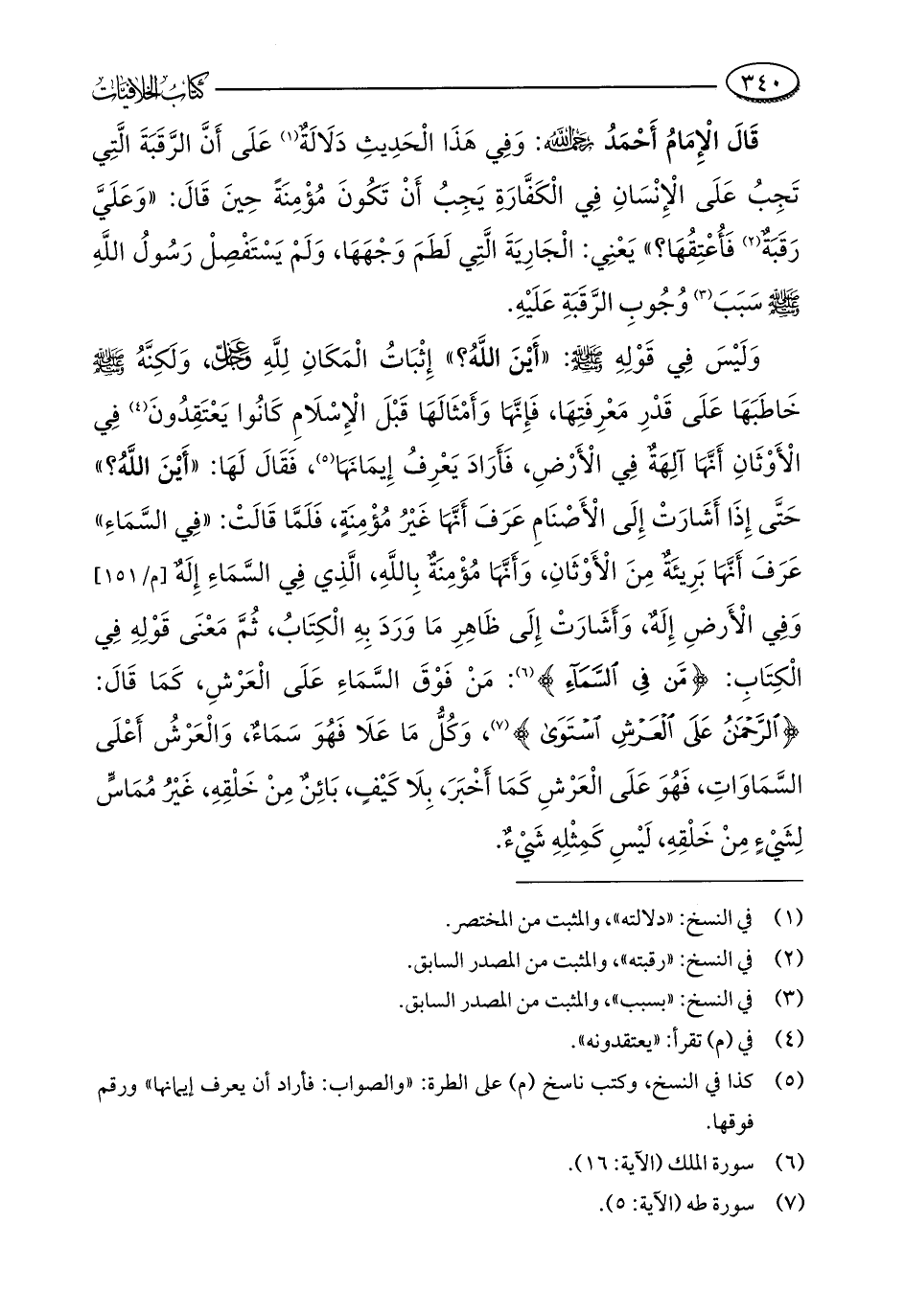 قَالَ الْإِمَامُ أَحْمَدُ - رحمه الله -: وَفِي هَذَا الْحَدِيثِ دَلَالَةٌ (¬1) عَلَى أَنَّ الرَّقَبَةَ الَّتِي تَجِبُ عَلَى الْإِنْسَانِ فِي الْكَفَّارَةِ يَجِبُ أَنْ تَكُونَ مُؤْمِنَةً حِينَ قَالَ: "وَعَلَيَّ رَقَبَةٌ (¬2) فَأُعْتِقُهَا؟ " يَعْنِي: الْجَارِيَةَ الَّتِي لَطَمَ وَجْهَهَا، وَلَمْ يَسْتَفْصِلْ رَسُولُ اللَّهِ - صلى الله عليه وسلم - سَبَبَ (¬3) وُجُوبِ الرَّقَبَةِ عَلَيْهِ.