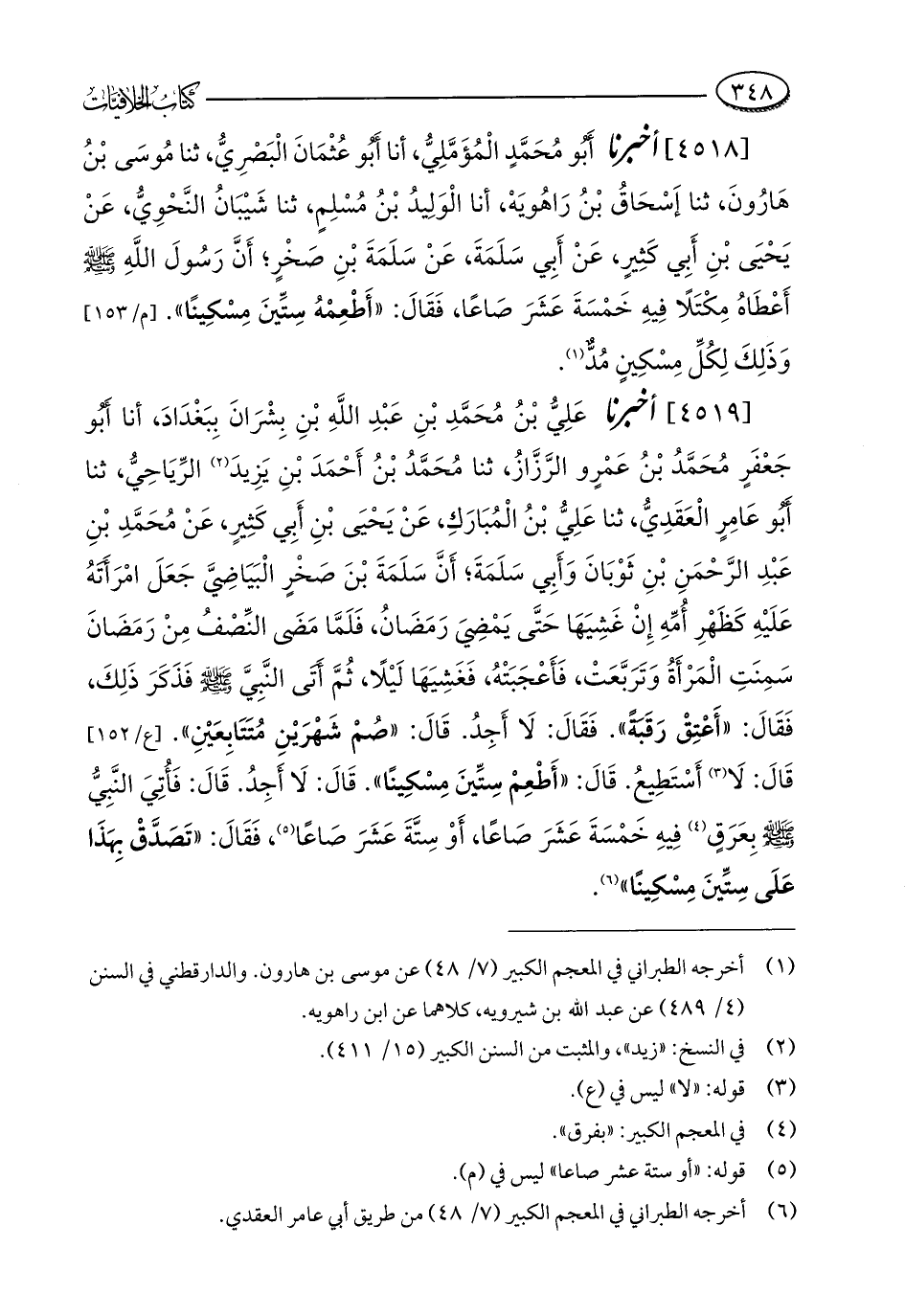 [4518] أخبرنا أَبُو مُحَمَّدٍ الْمُؤَمَّلِيُّ، أنا أَبُو عُثْمَانَ الْبَصْرِيُّ، ثنا مُوسَى بْنُ هَارُونَ، ثنا إِسْحَاقُ بْنُ رَاهُويَهْ، أنا الْوَلِيدُ بْنُ مُسْلِمٍ، ثنا شَيْبَانُ النَّحْوِيُّ، عَنْ يَحْيَى بْنِ أَبِي كَثِيرٍ، عَنْ أَبِي سَلَمَةَ، عَنْ سَلَمَةَ بْنِ صَخْرٍ؛ أَنَّ رَسُولَ اللَّهِ - صلى الله عليه وسلم - أَعْطَاهُ مِكْتَلًا فِيهِ خَمْسَةَ عَشَرَ صَاعًا، فَقَالَ: "أَطْعِمْهُ سِتِّينَ مِسْكِينًا". وَذَلِكَ لِكُلِّ مِسْكِينٍ مُدٌّ (¬1).