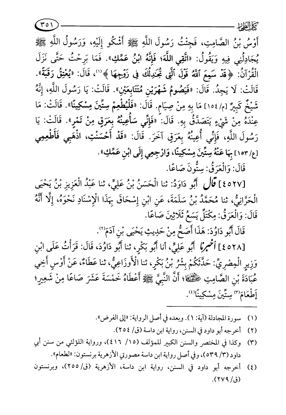 (¬4) أخرجه أبو داود في السنن، رواية ابن داسة، الأزهرية (ق/ 255)، وبرنستون (ق/ 279).