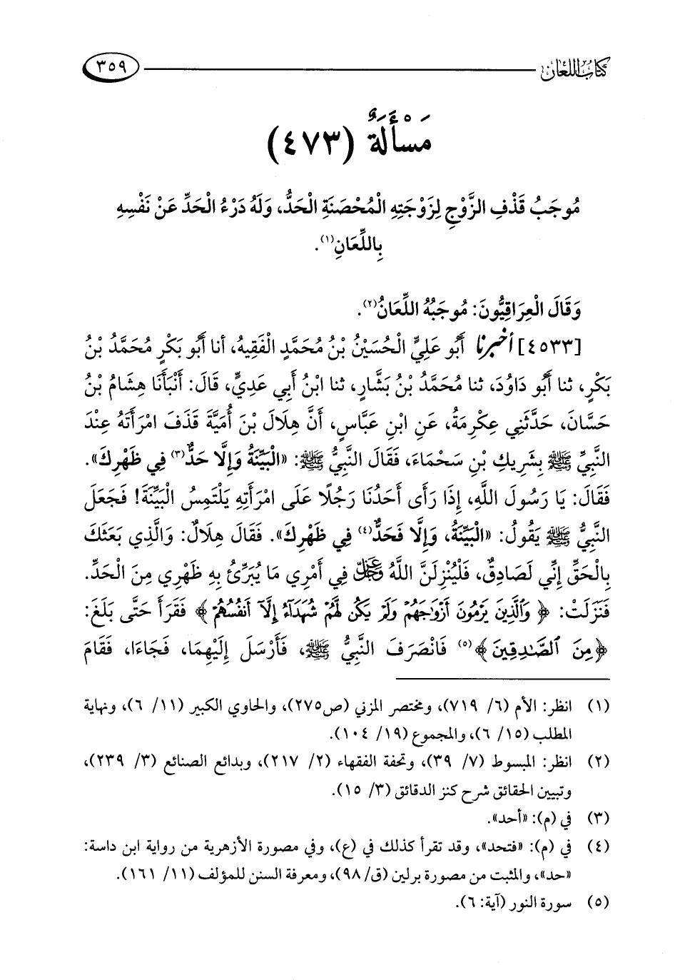 مَسْأَلَةٌ (473): مُوجَبُ قَذْفِ الزَّوْجِ لِزَوْجَتِهِ الْمُحْصَنَةِ الْحَدُّ، وَلَهُ دَرْءُ الْحَدِّ عَنْ نَفْسِهِ بِاللِّعَانِ (¬1).